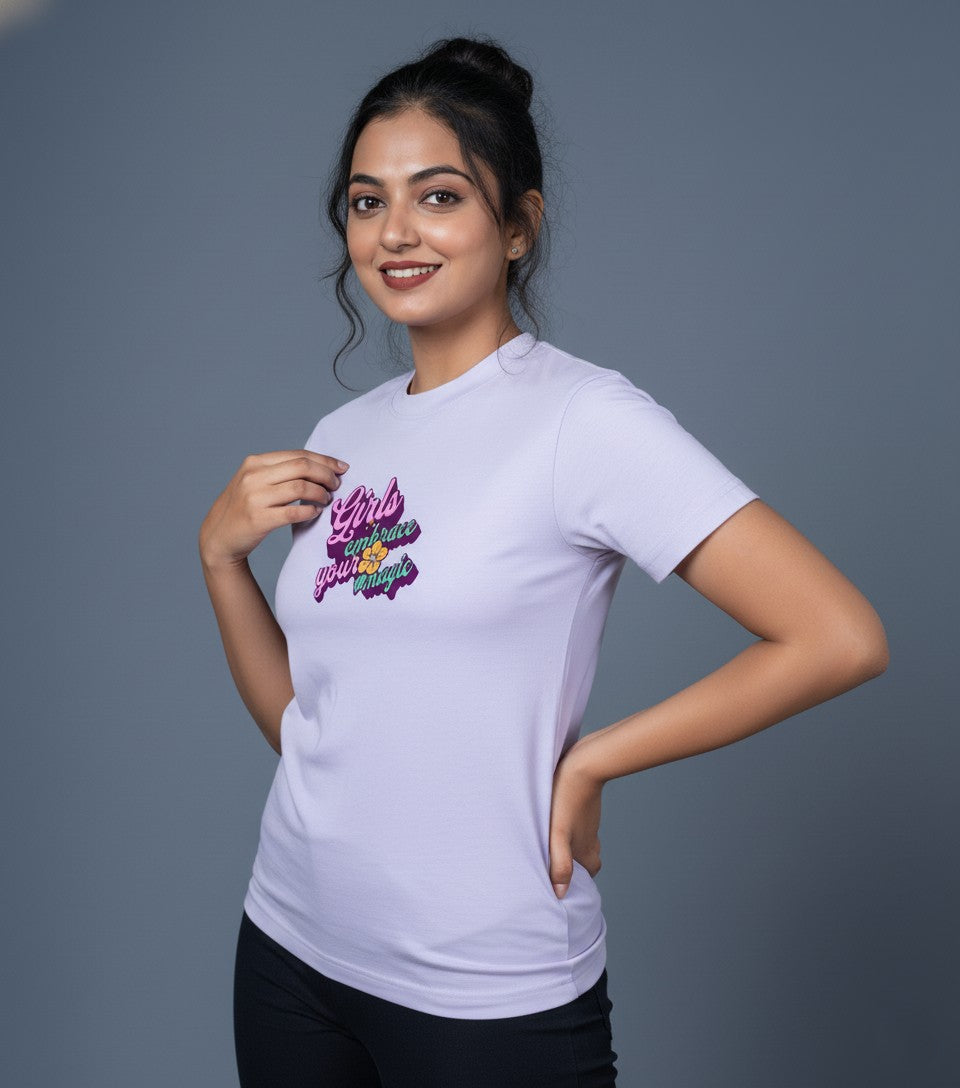 Channel your inner glow with our “Girls Embrace Your Magic” Women’s T-Shirt, crafted for girls who believe in their sparkle, confidence and charm. 🌸💖