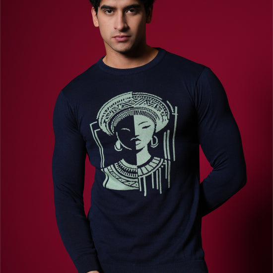 Make a bold statement this season with our Premium 100% Cotton Flat Knit Sweater, featuring an artistic woven graphic that adds a touch of culture and modern style.