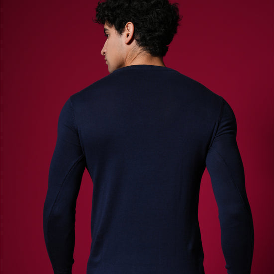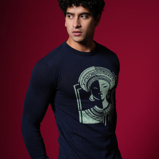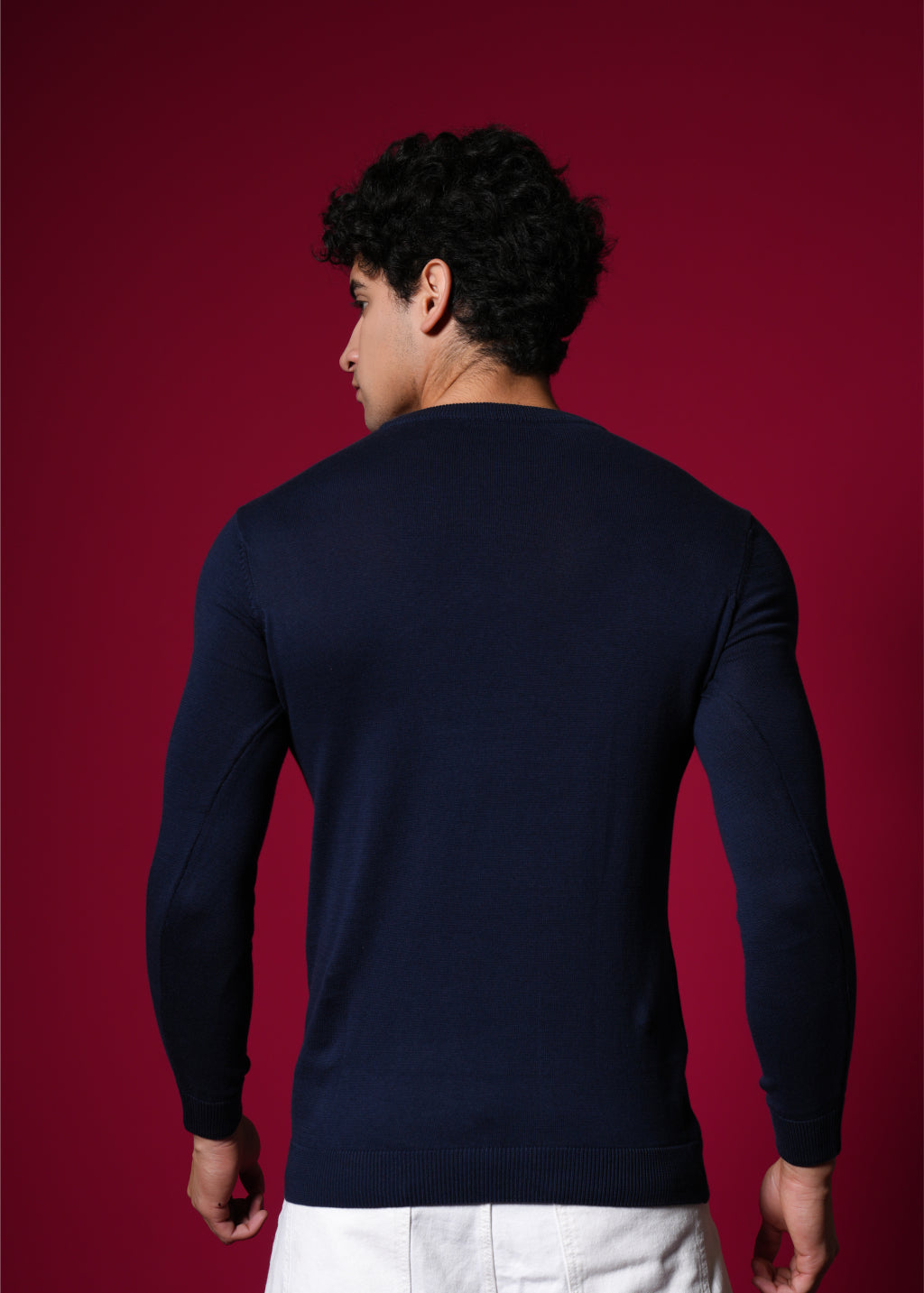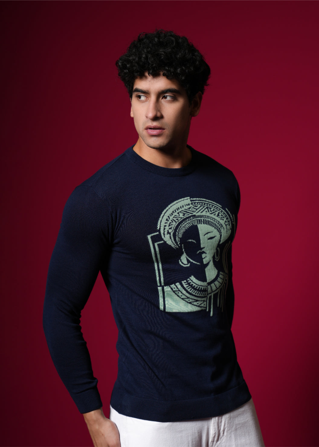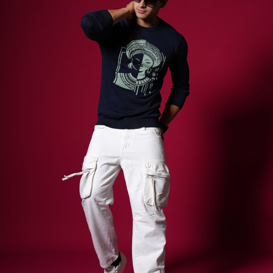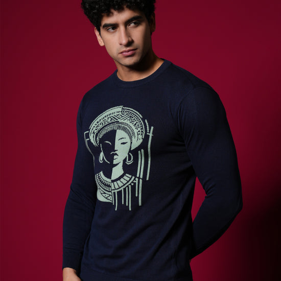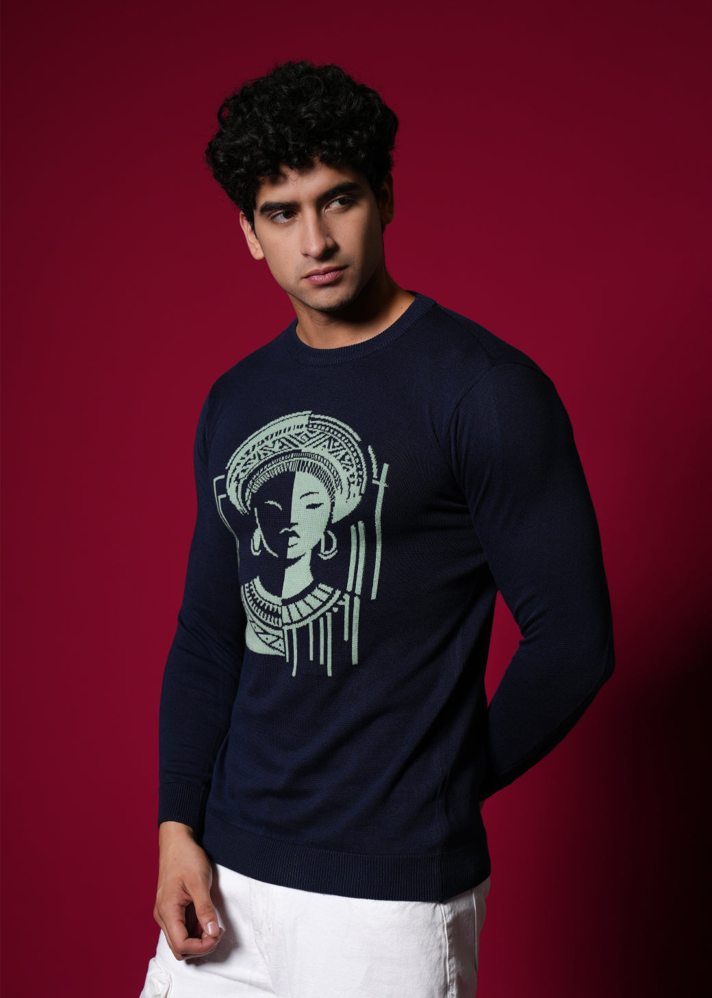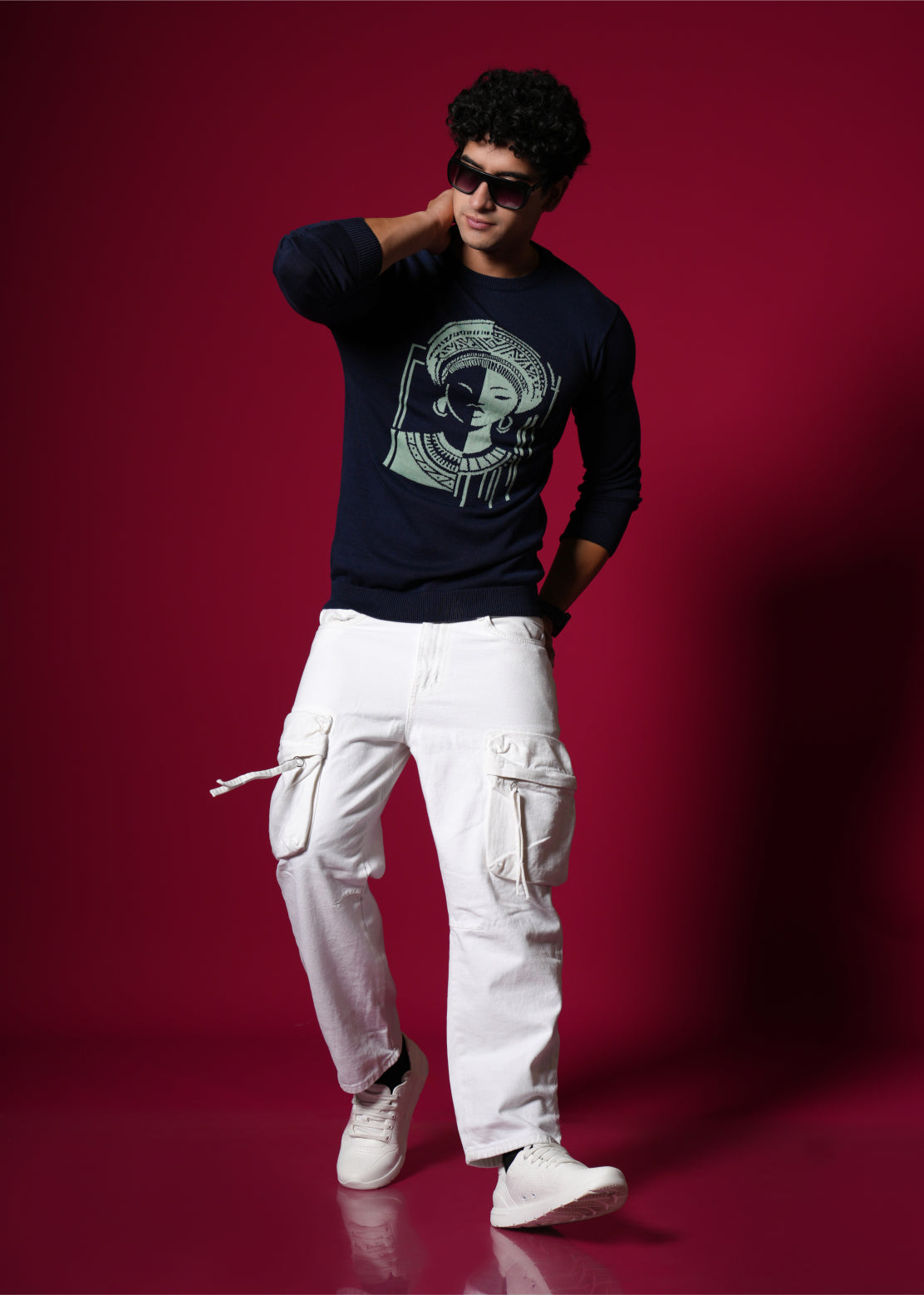 Men’s 100% Cotton Flat Knit Graphic Sweater – Premium Navy Blue Winter wear