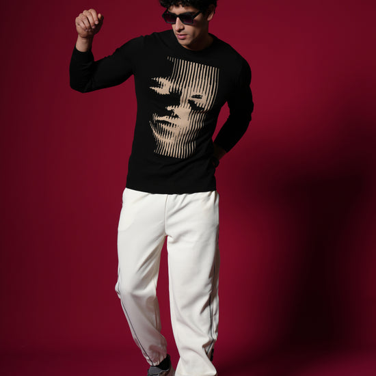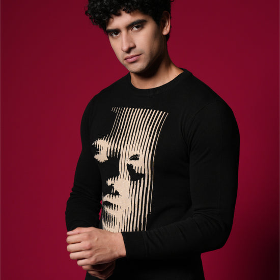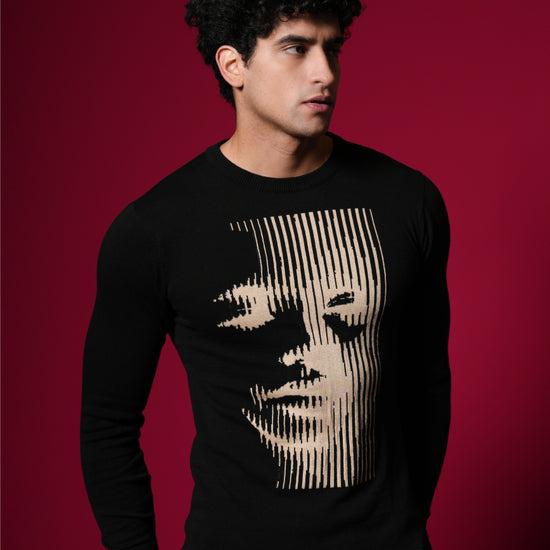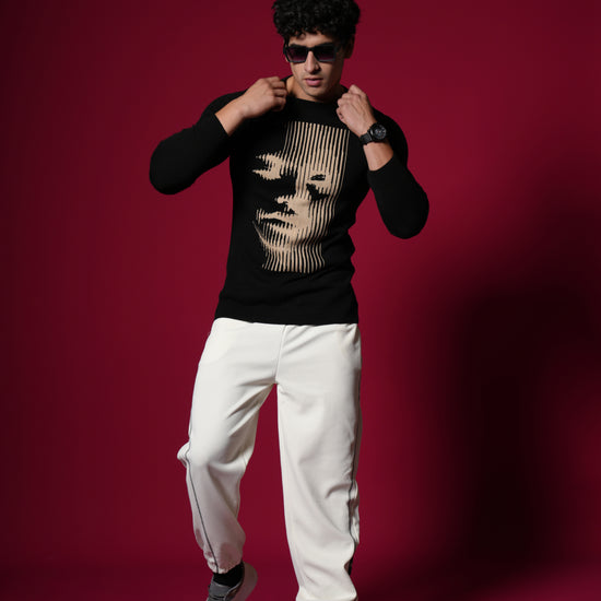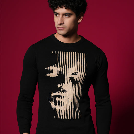 Men’s Pure Cotton Flat Knit Sweater – Abstract Face Graphic | Premium Black Winter wear