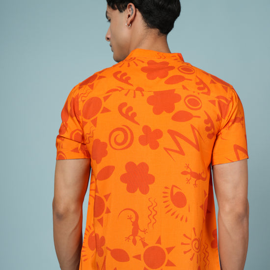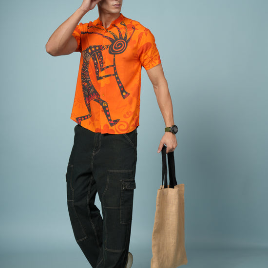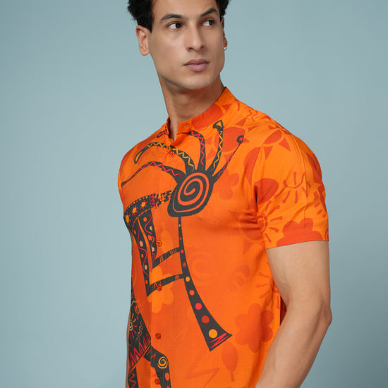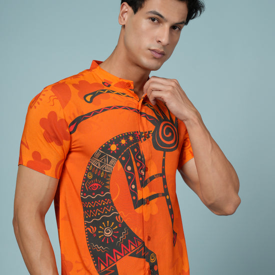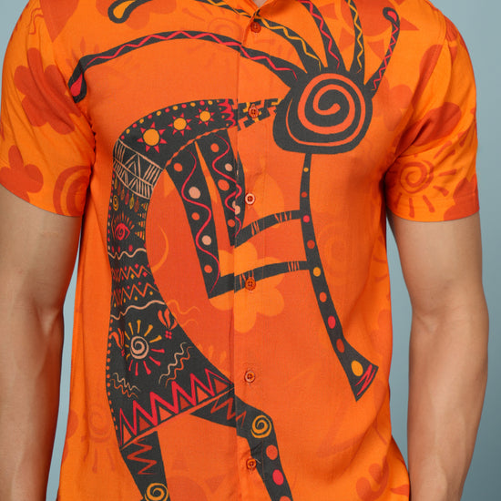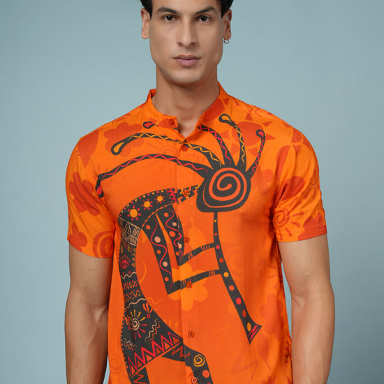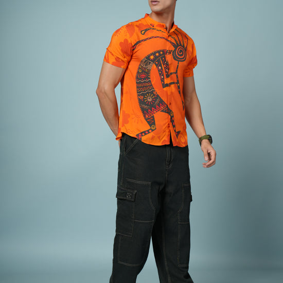 Stand out from the crowd with this Men’s Tribal Art Print Rayon Shirt, crafted from ultra-soft and breathable premium rayon fabric. Designed for men who love bold, artistic style, this shirt showcases a striking tribal-inspired print in vivid orange and black tones — perfect for adding energy to your summer wardrobe.