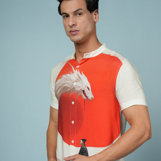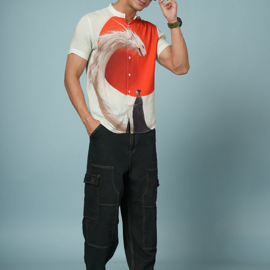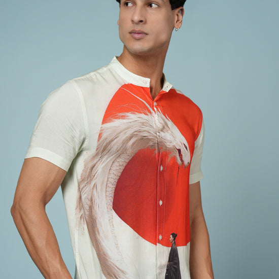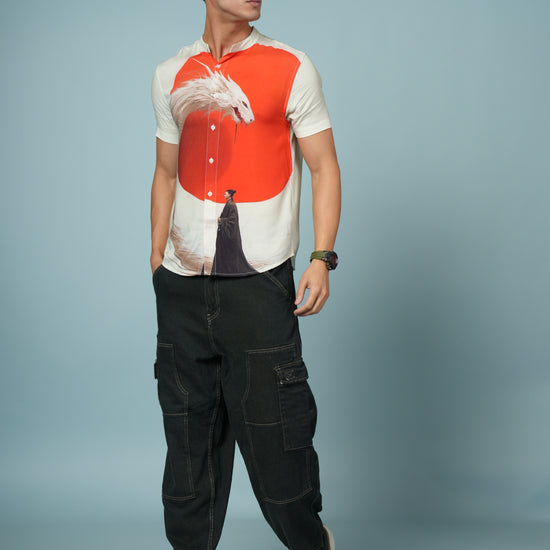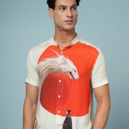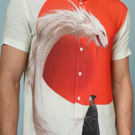Men’s Samurai & Dragon Print Rayon Shirt – Bold Artistic Casual Wear