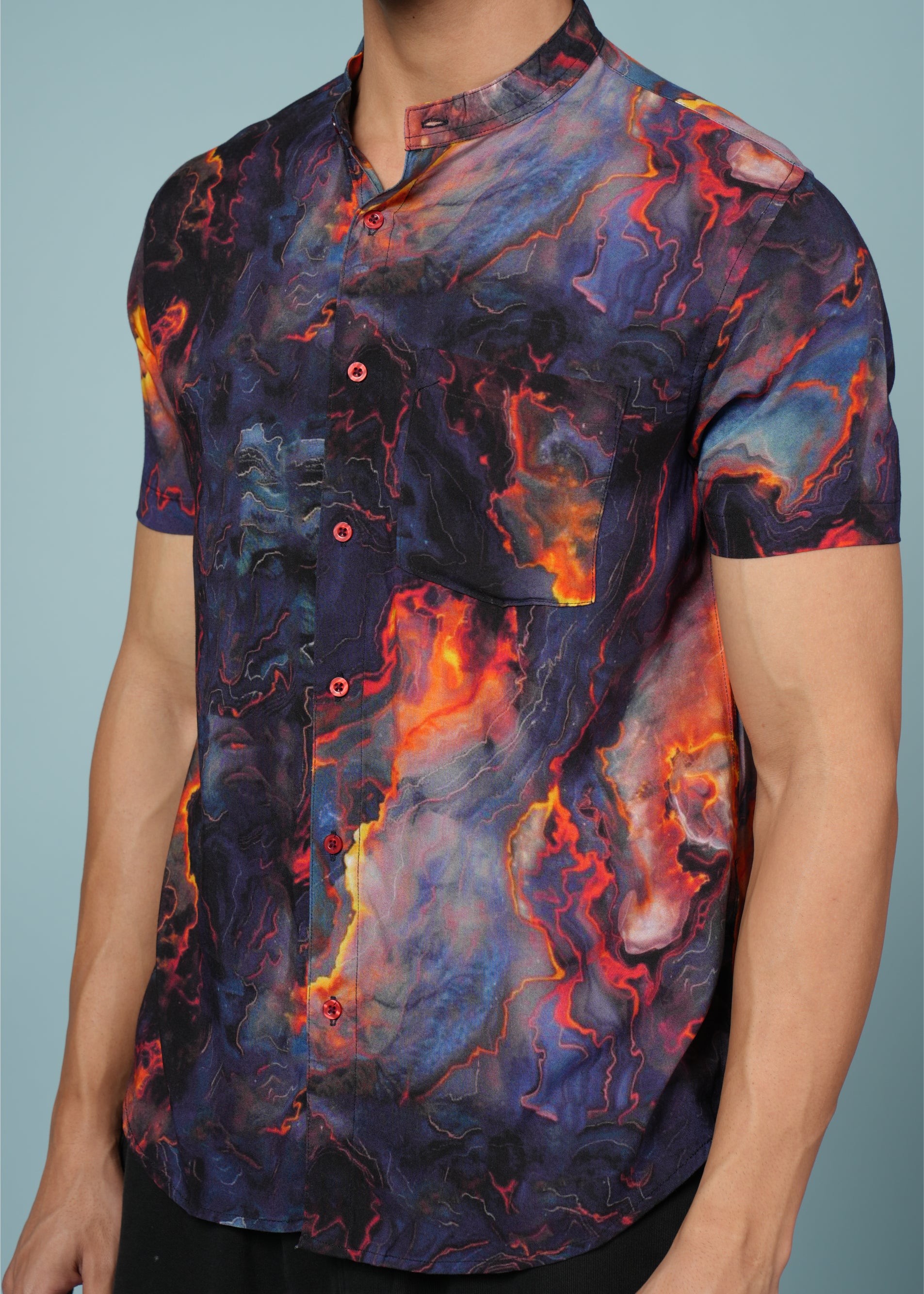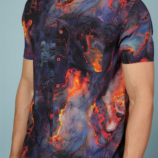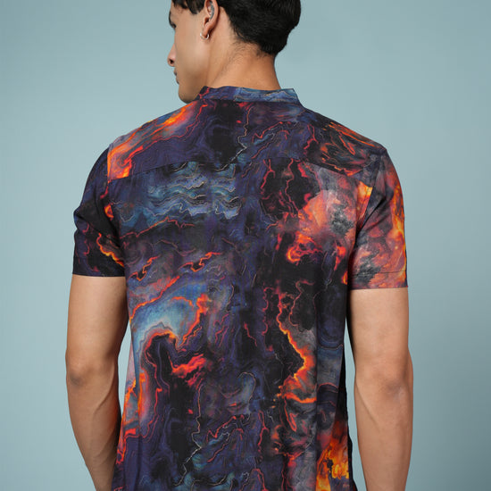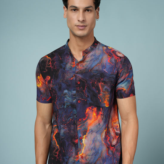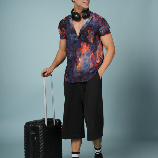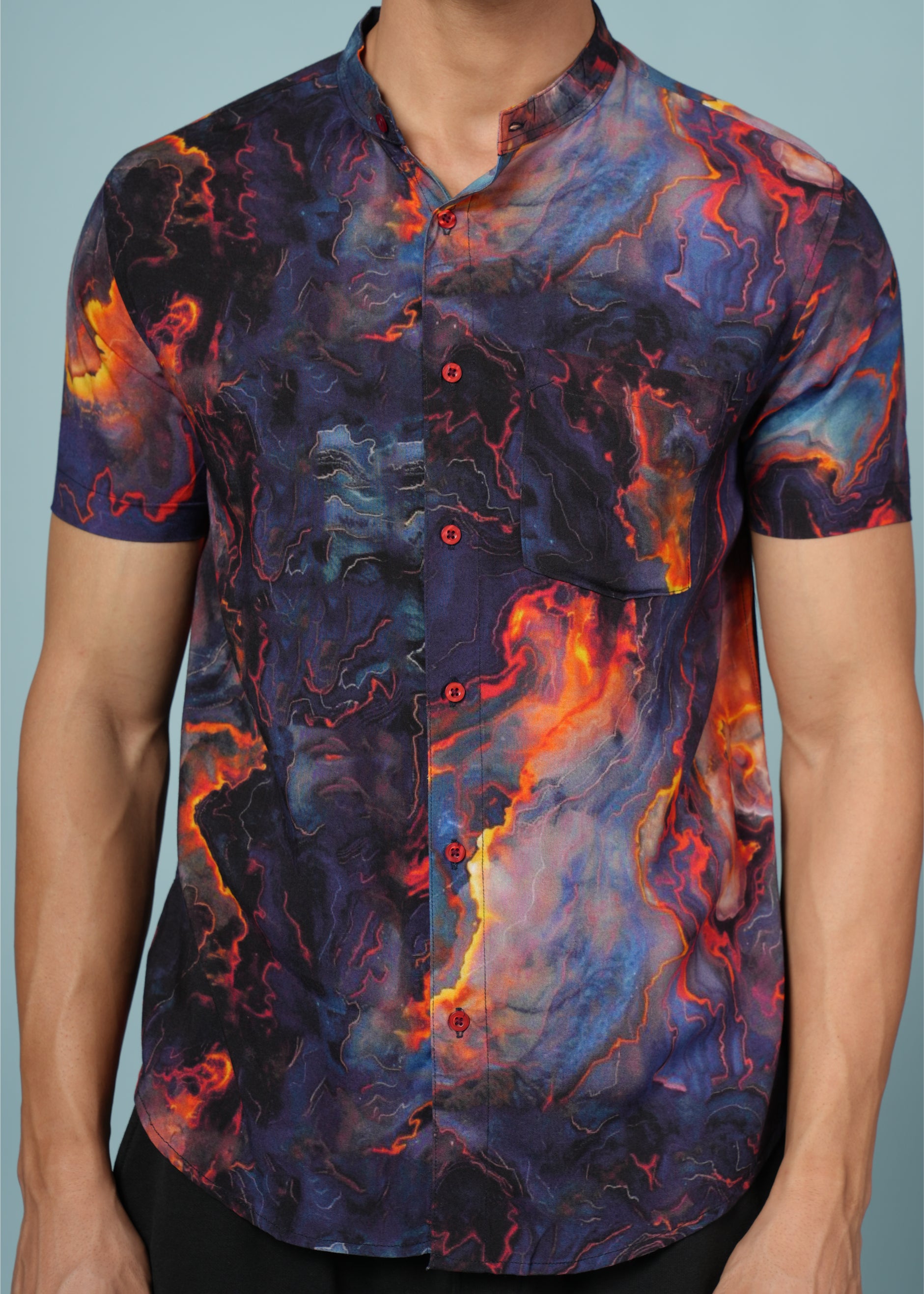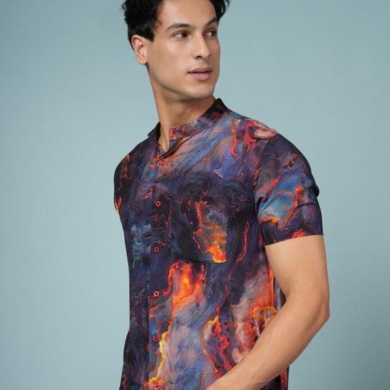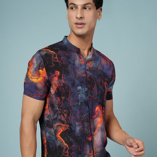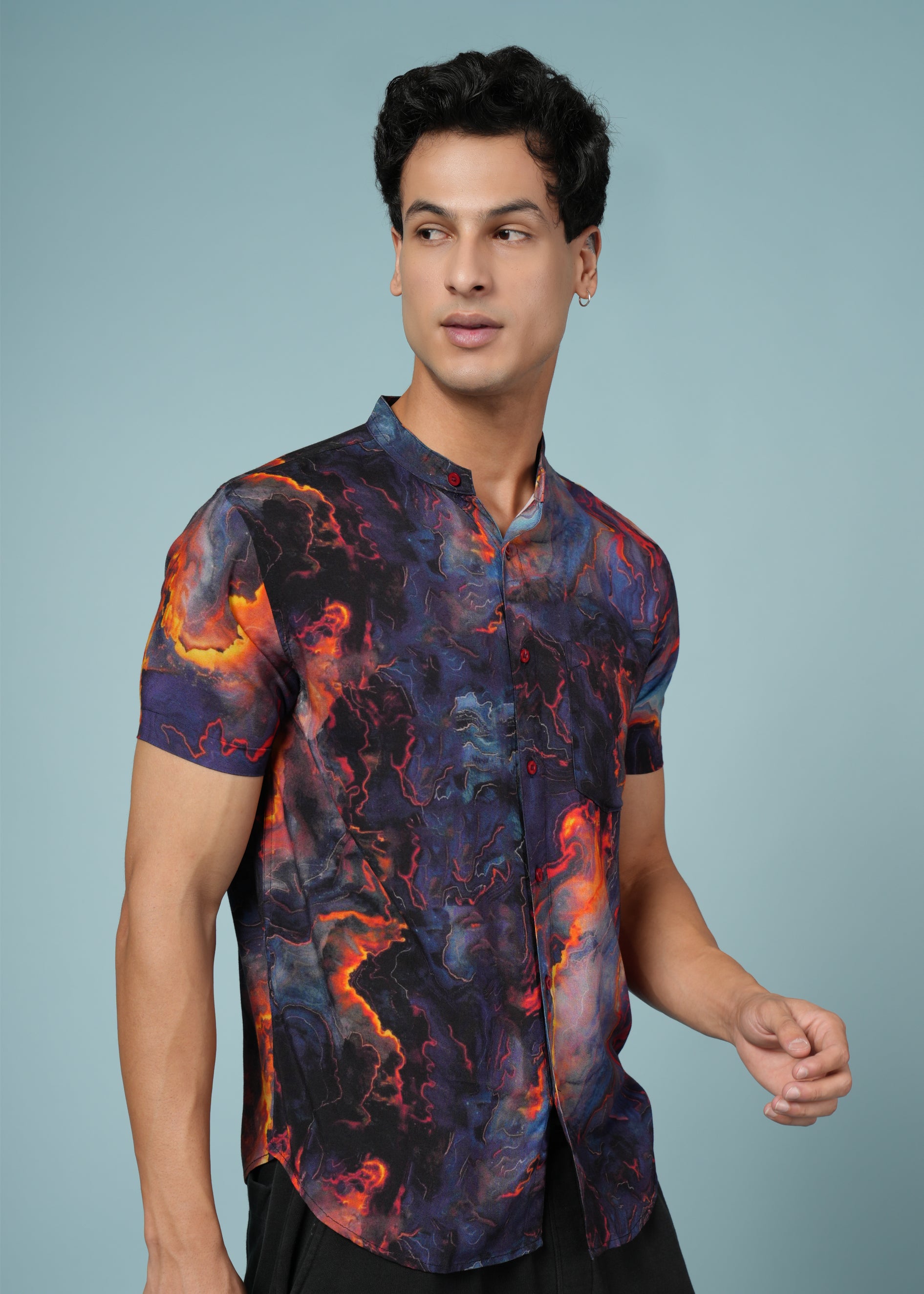 Turn up the heat with this Men’s Abstract Printed Rayon Shirt, featuring a fiery fusion of deep black, orange, and blue tones. Crafted from premium soft rayon fabric, it offers a smooth, lightweight feel and excellent breathability for all-day comfort. The Mandarin collar and short sleeves give it a refined yet modern edge, perfect for parties, evening events, or weekend getaways. With its bold artistic pattern, this shirt adds instant character to your look.