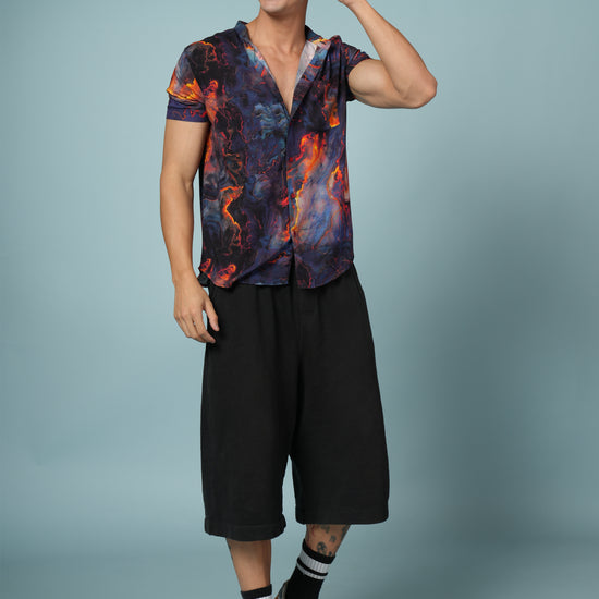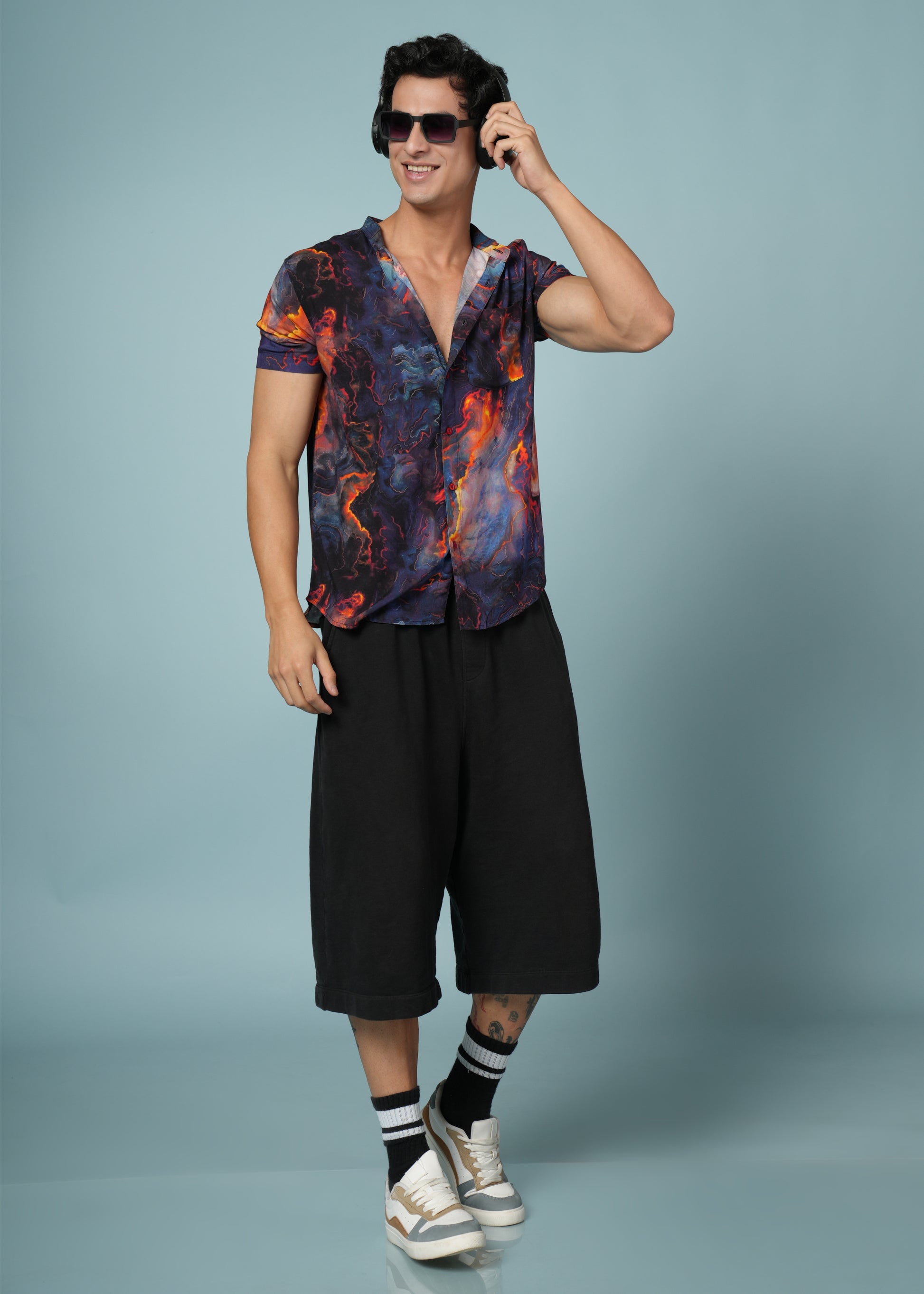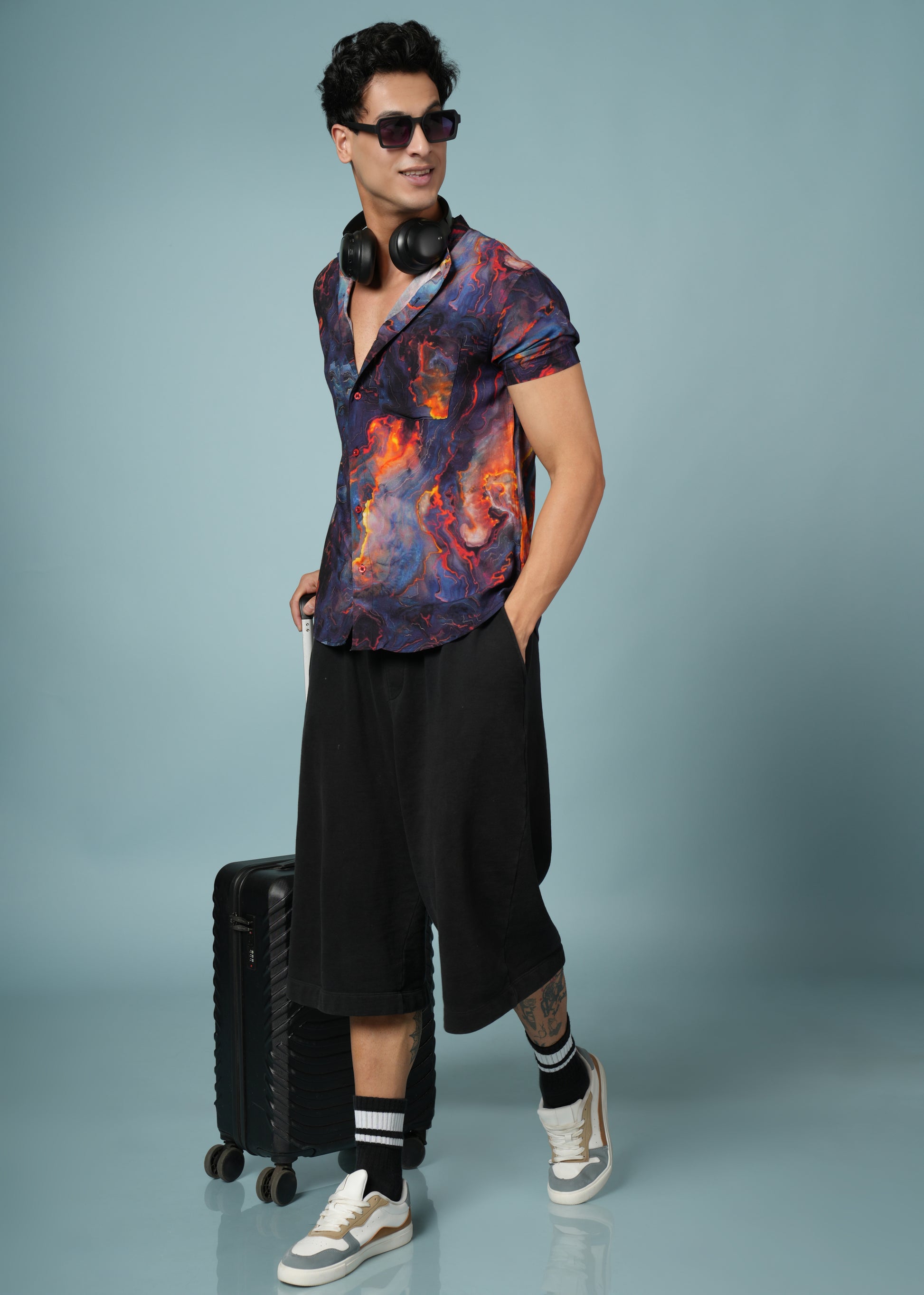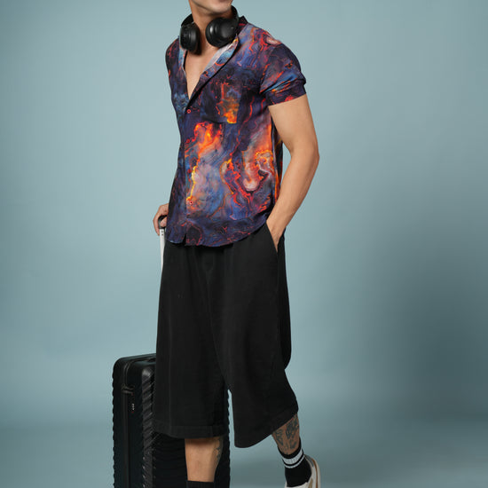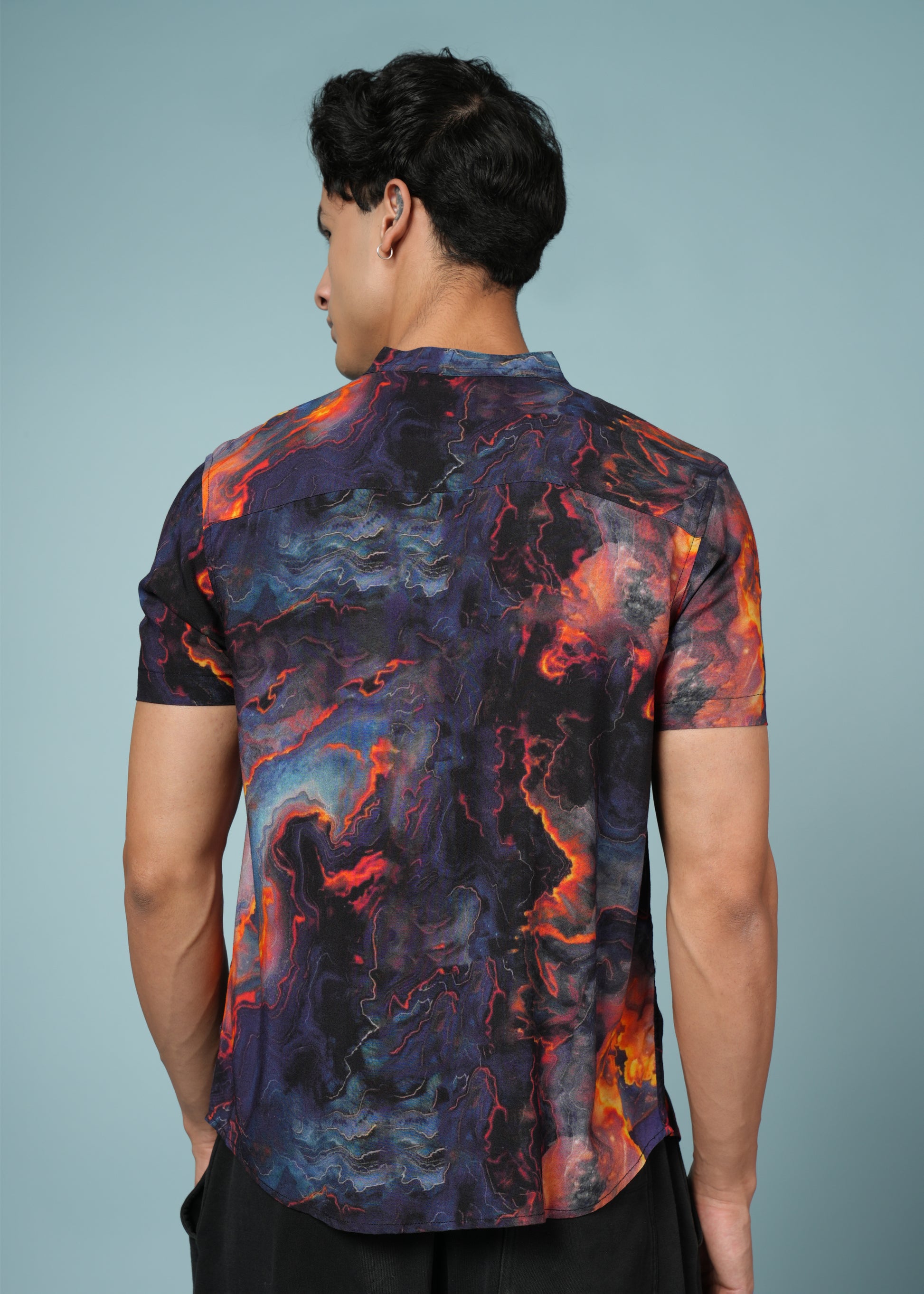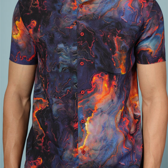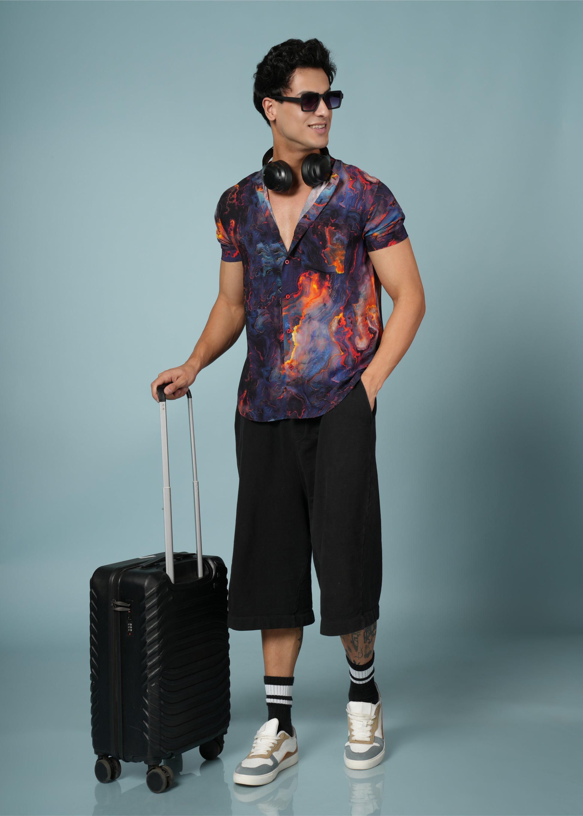 Turn up the heat with this Men’s Abstract Printed Rayon Shirt, featuring a fiery fusion of deep black, orange, and blue tones. Crafted from premium soft rayon fabric, it offers a smooth, lightweight feel and excellent breathability for all-day comfort. The Mandarin collar and short sleeves give it a refined yet modern edge, perfect for parties, evening events, or weekend getaways. With its bold artistic pattern, this shirt adds instant character to your look.