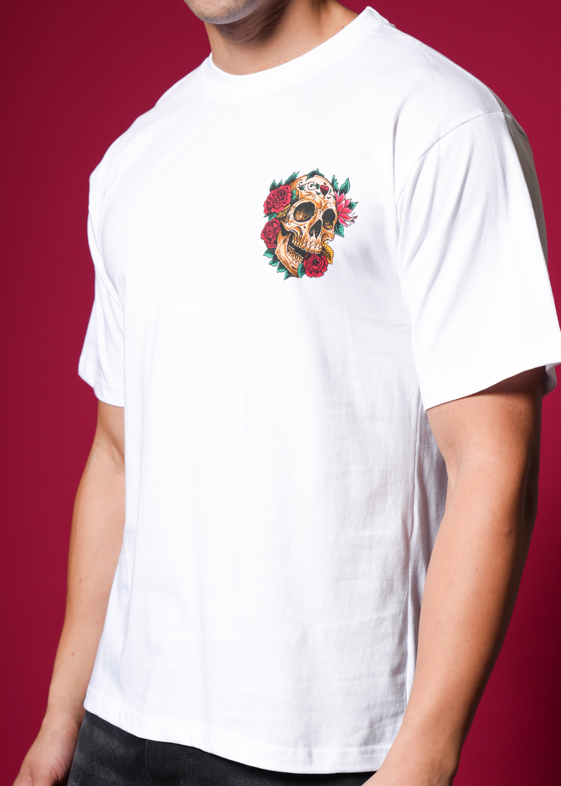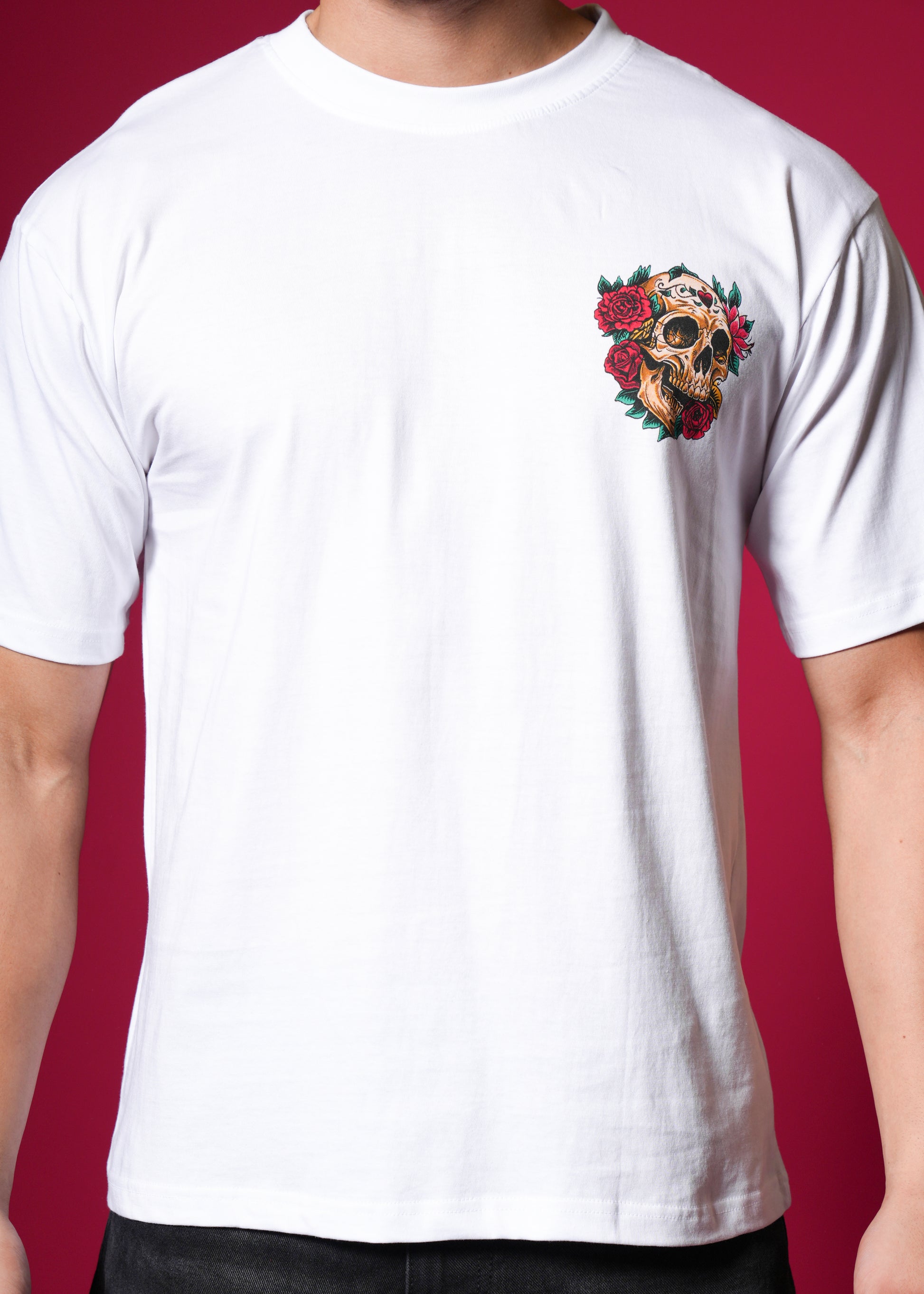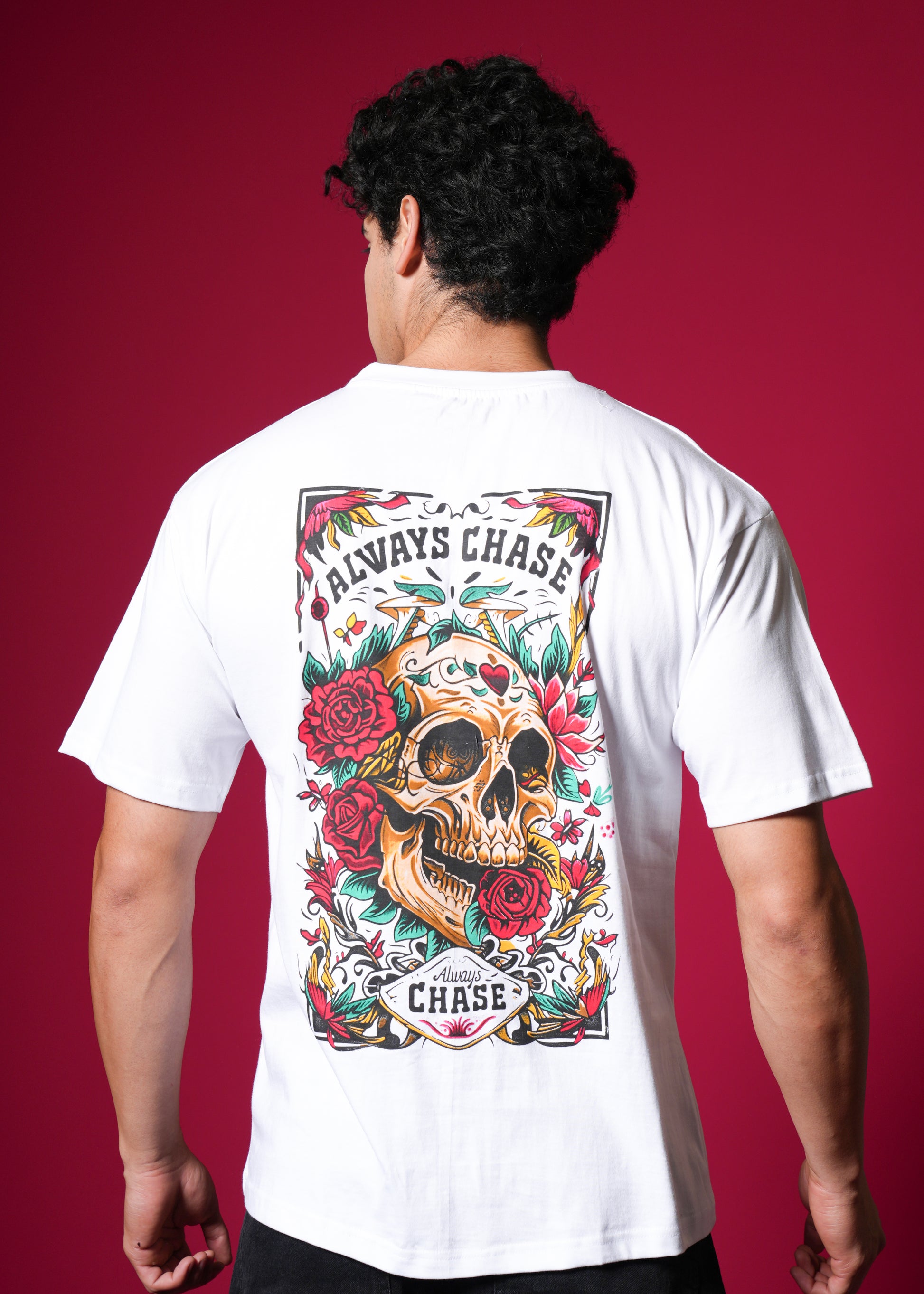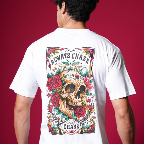The back print features a skull entwined with roses and vines, surrounded by bold gothic lettering that reads Always Chase β a symbol of passion, grit, and unstoppable energy πΉπ.