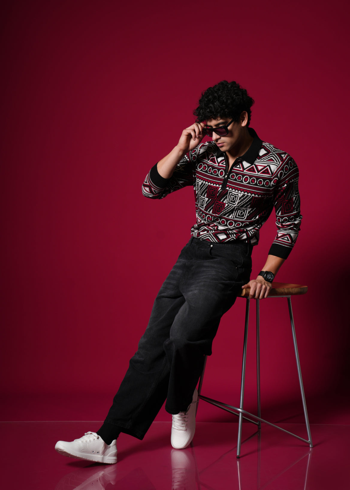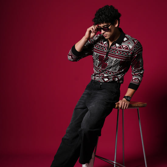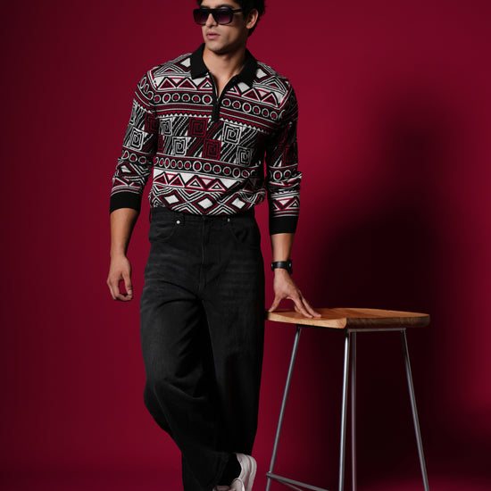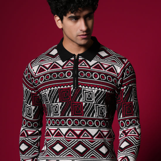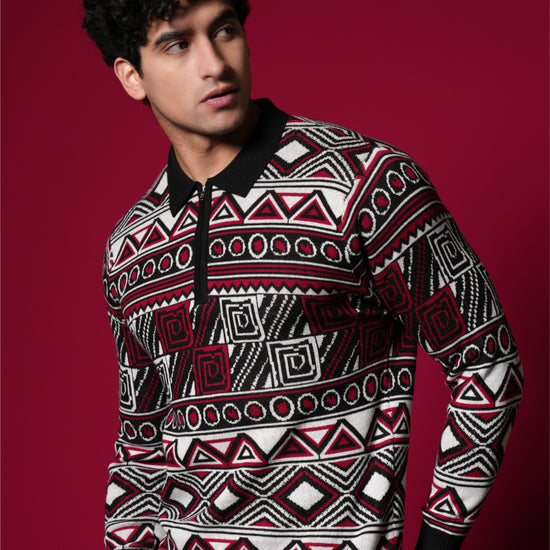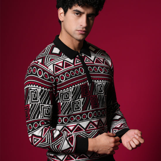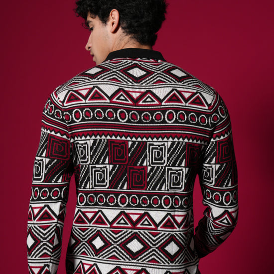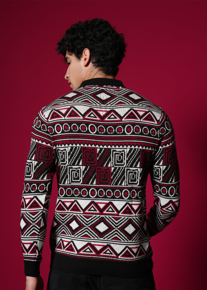 Designed with an eye-catching geometric pattern in bold black, white and red tones, this sweater brings a perfect blend of style and warmth for everyday wear.