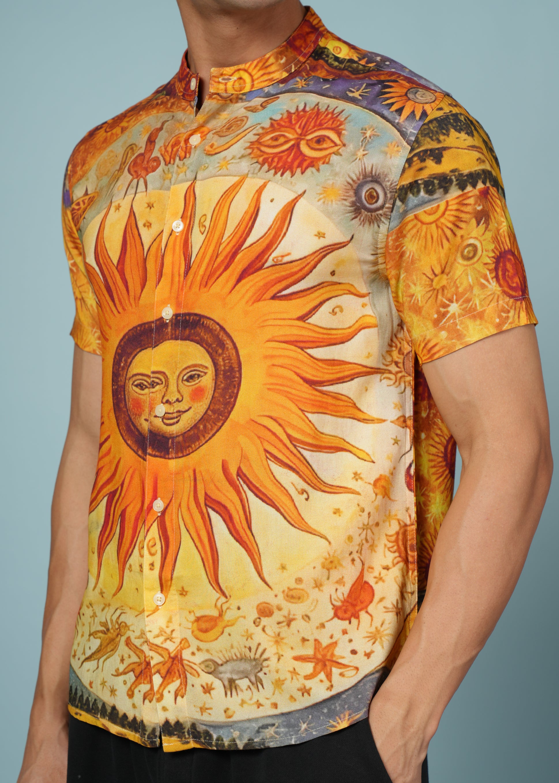 Men’s Sun Print Rayon Shirt – Vibrant Casual Wear with Mandarin Collar