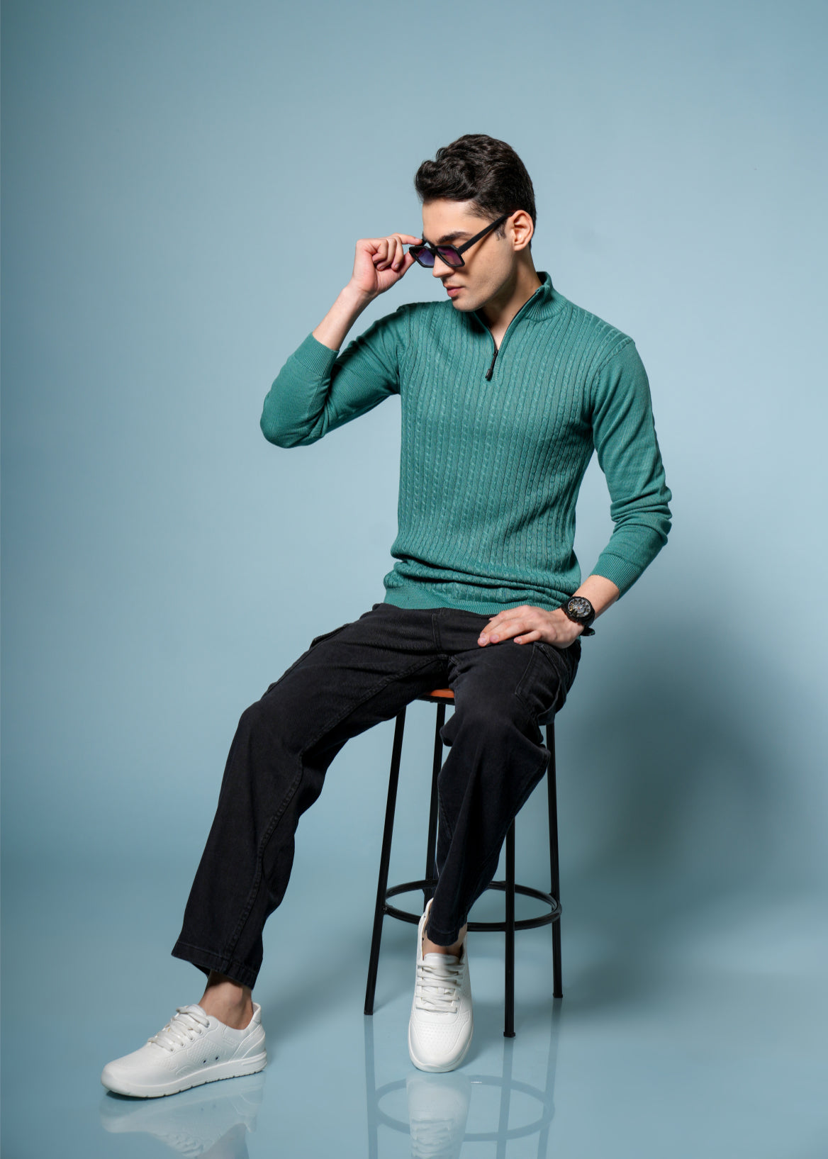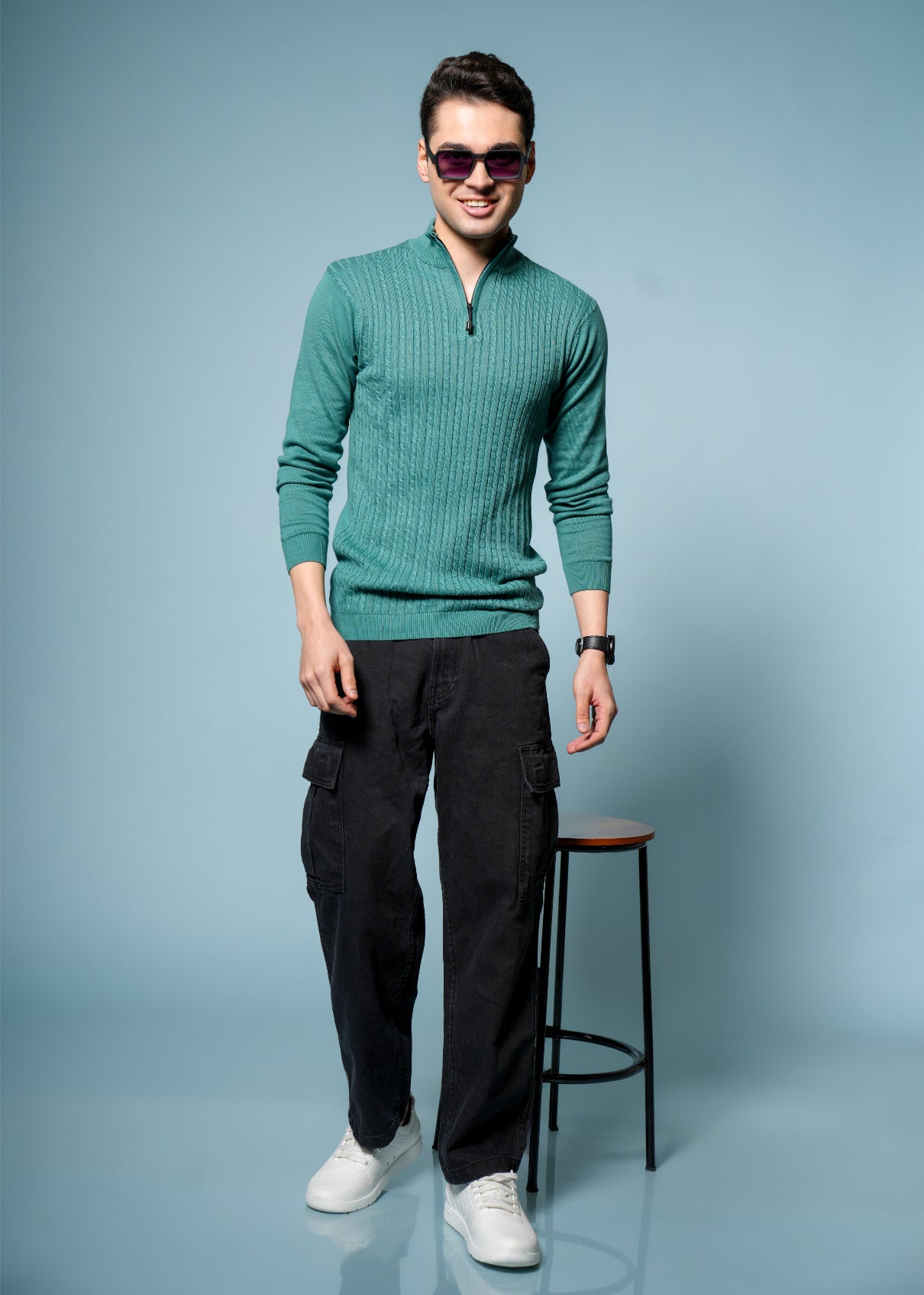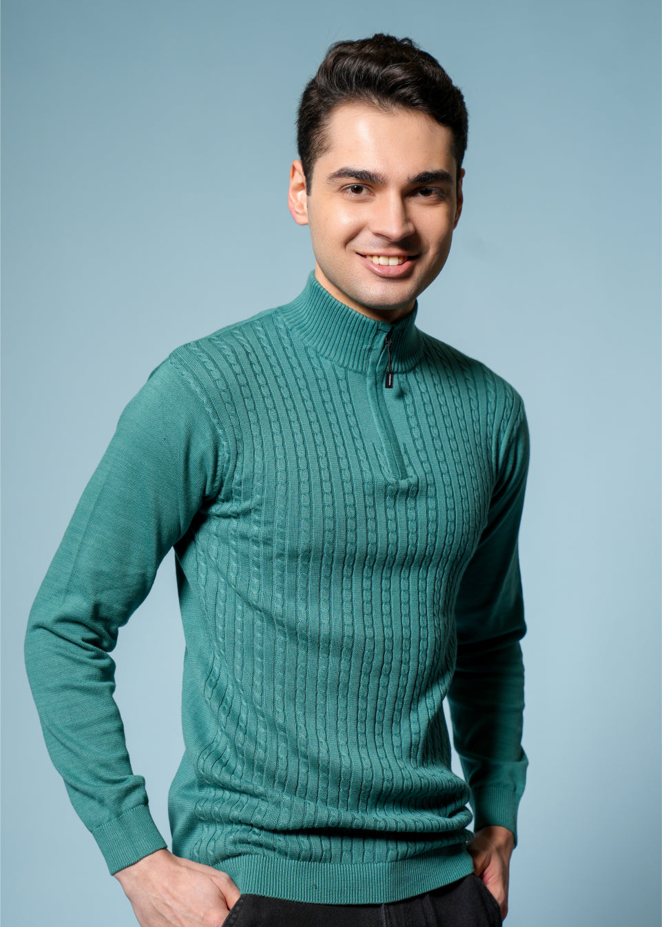 Men’s Pure Cotton Sea Green Textured Knit Sweater – Premium Comfort & Timeless Style