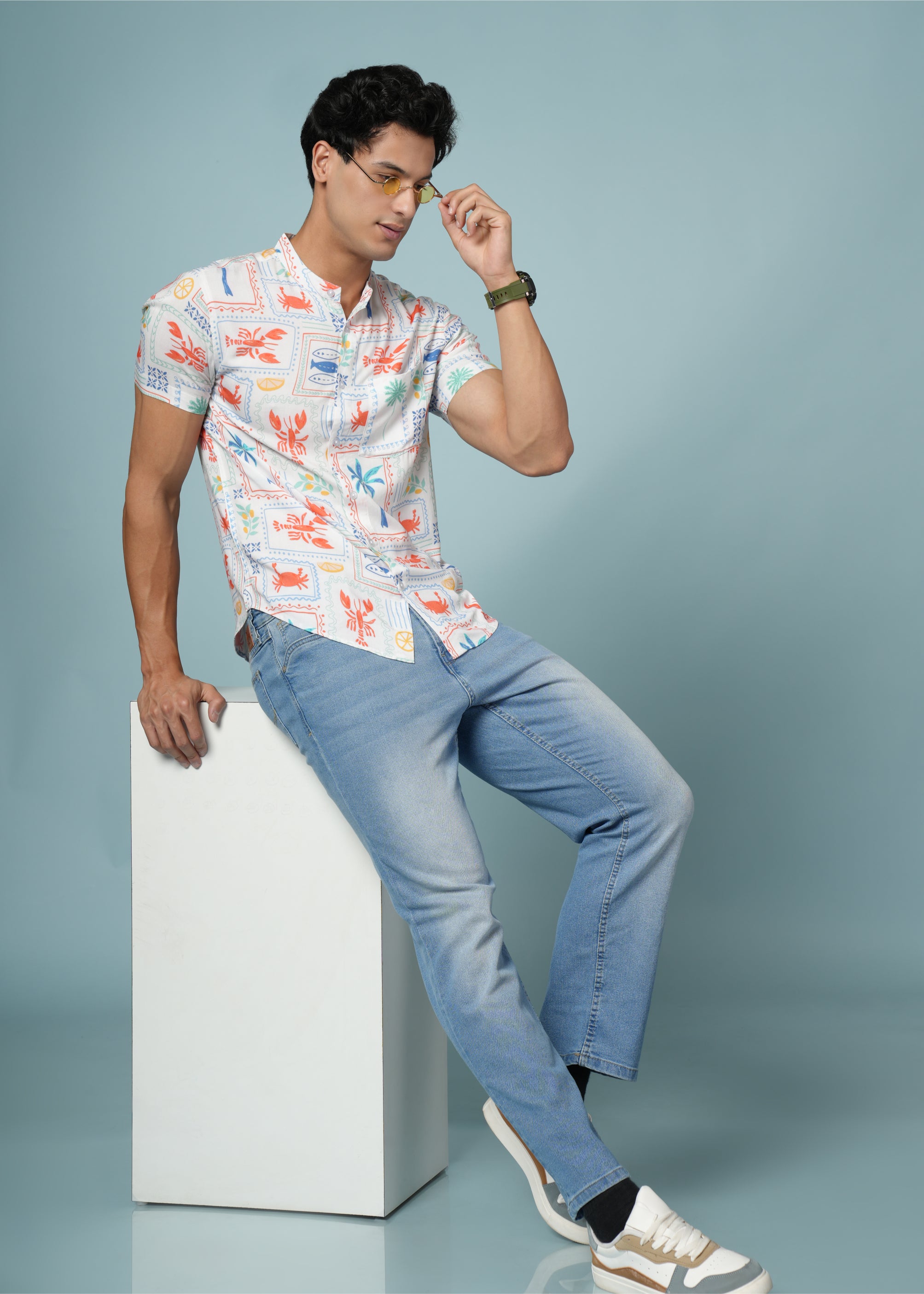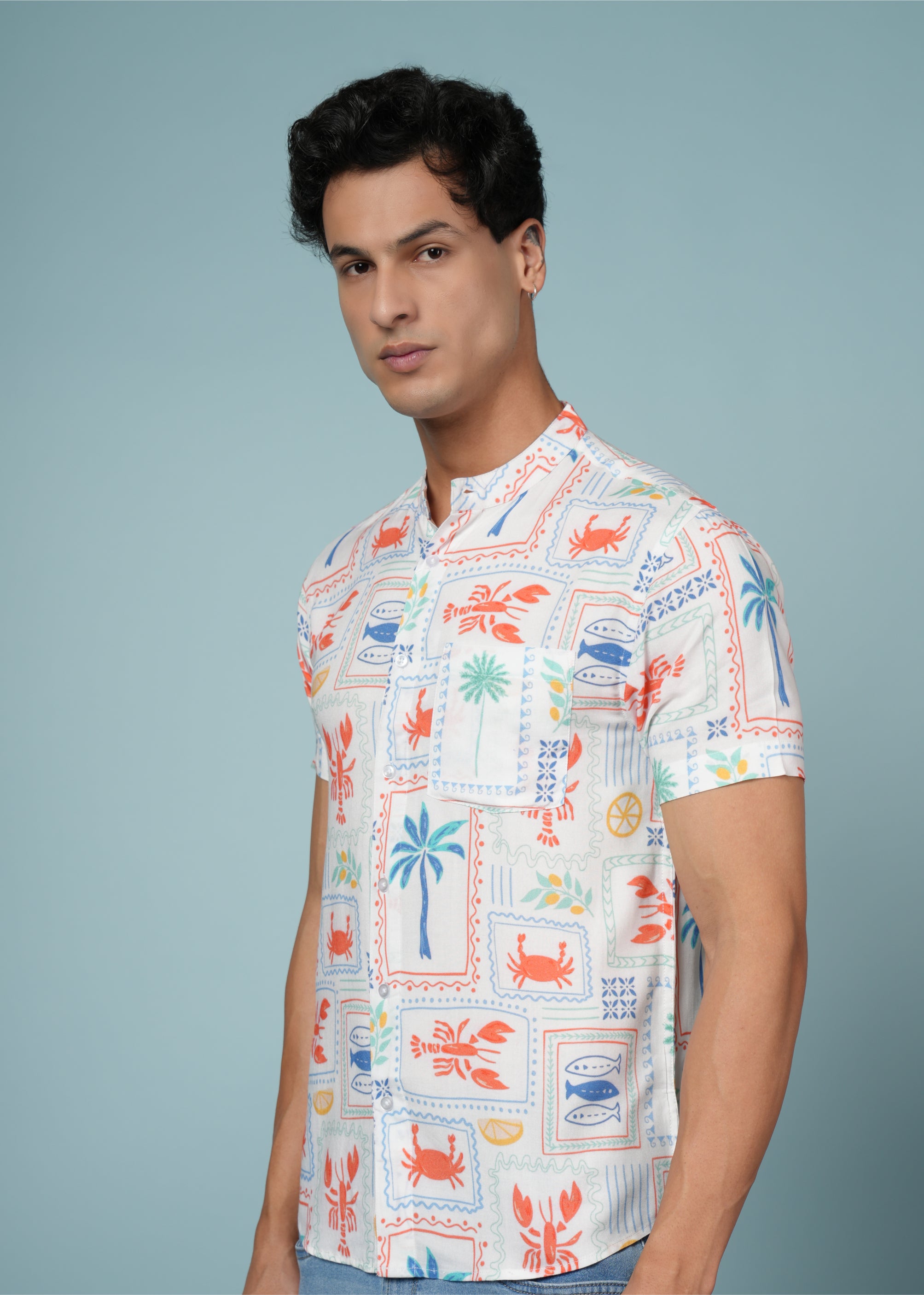 The playful multi-color abstract pattern adds a modern, tropical vibe that’s perfect for vacations, beach days, or weekend outings. With a Mandarin collar and short sleeves, this shirt balances casual comfort with trendy design.