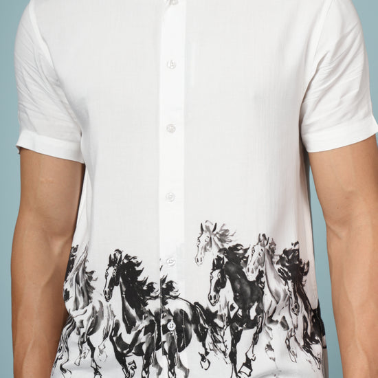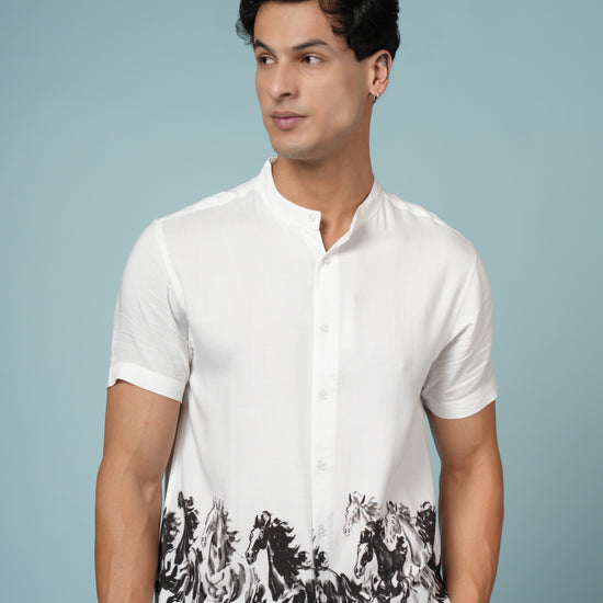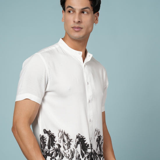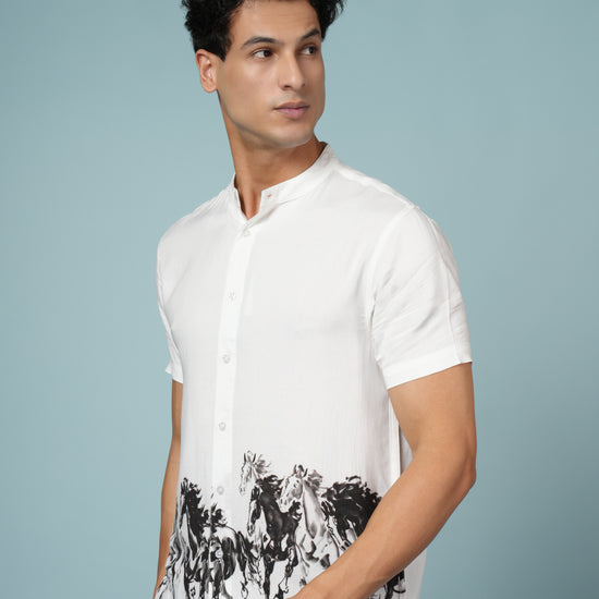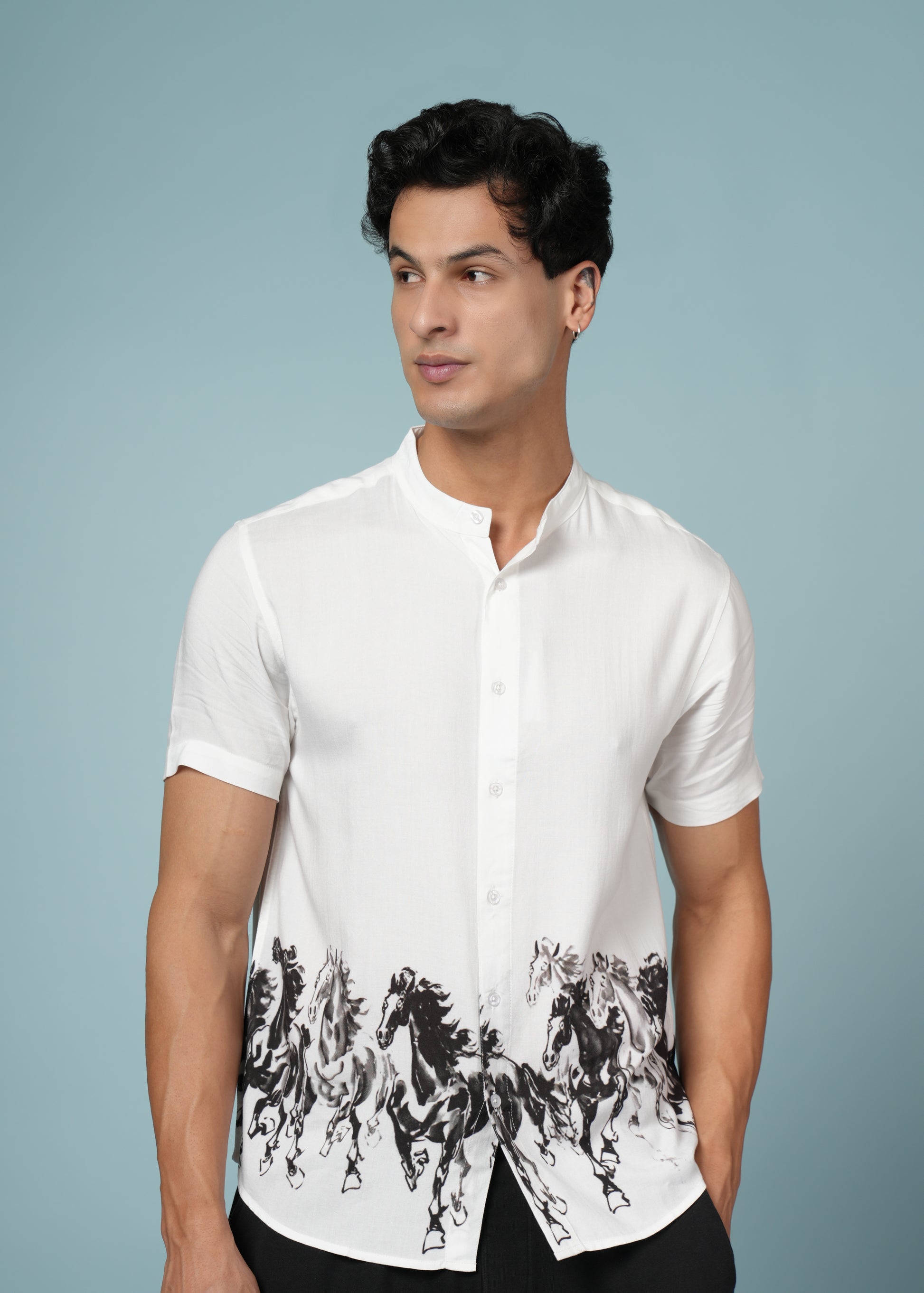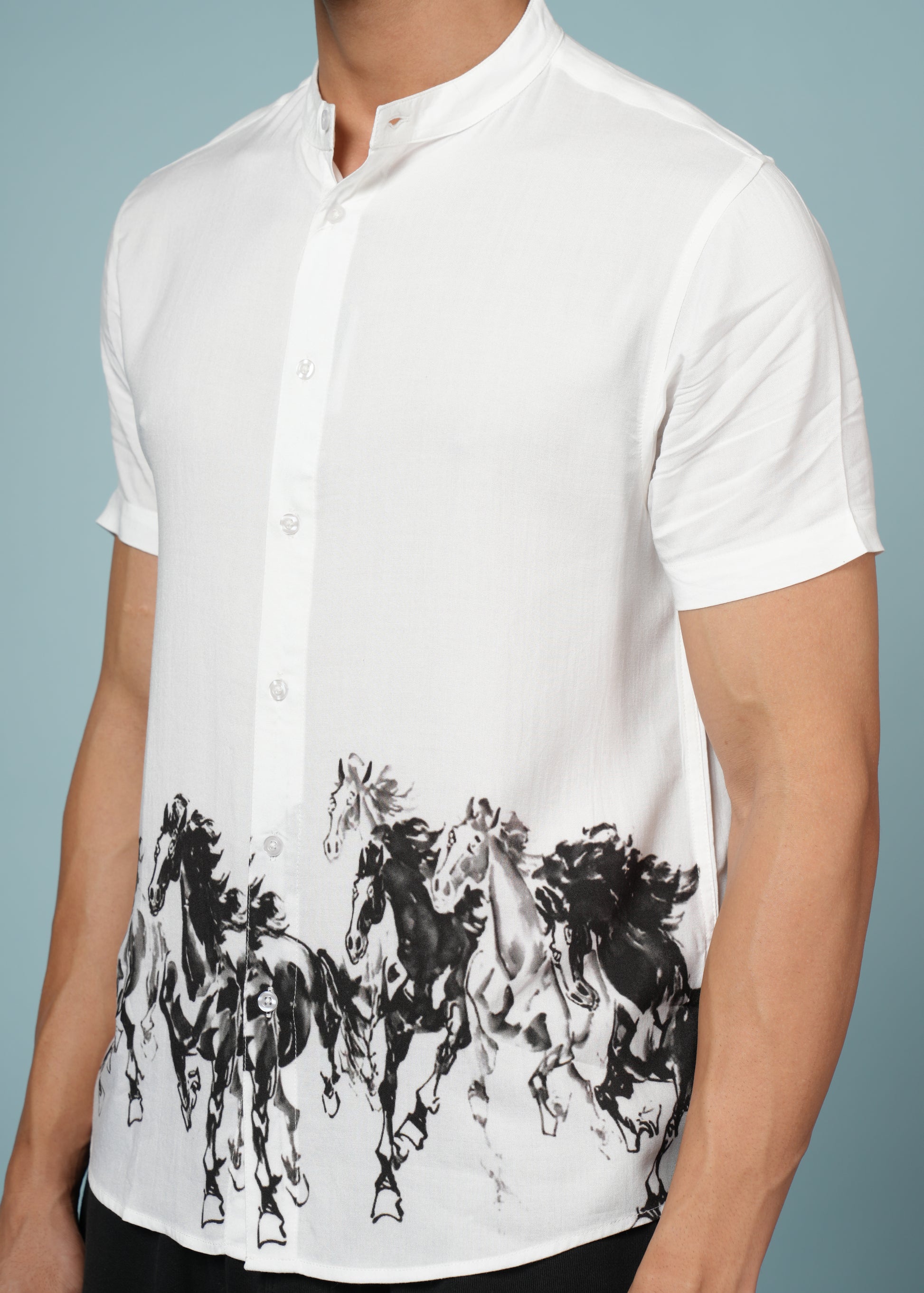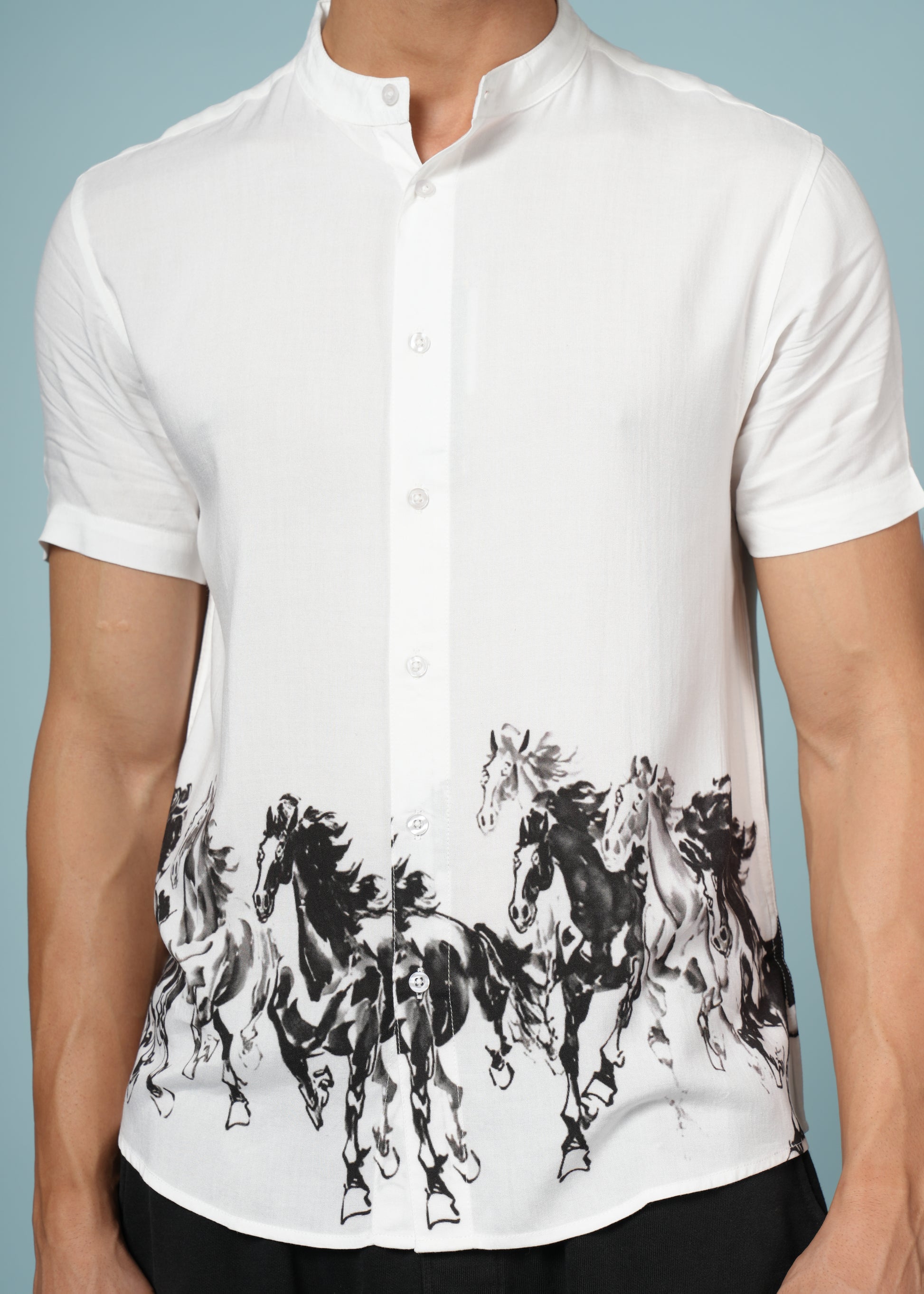 Men’s White Printed Shirt with Running Horse Design – Modern Mandarin Collar