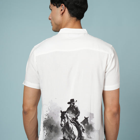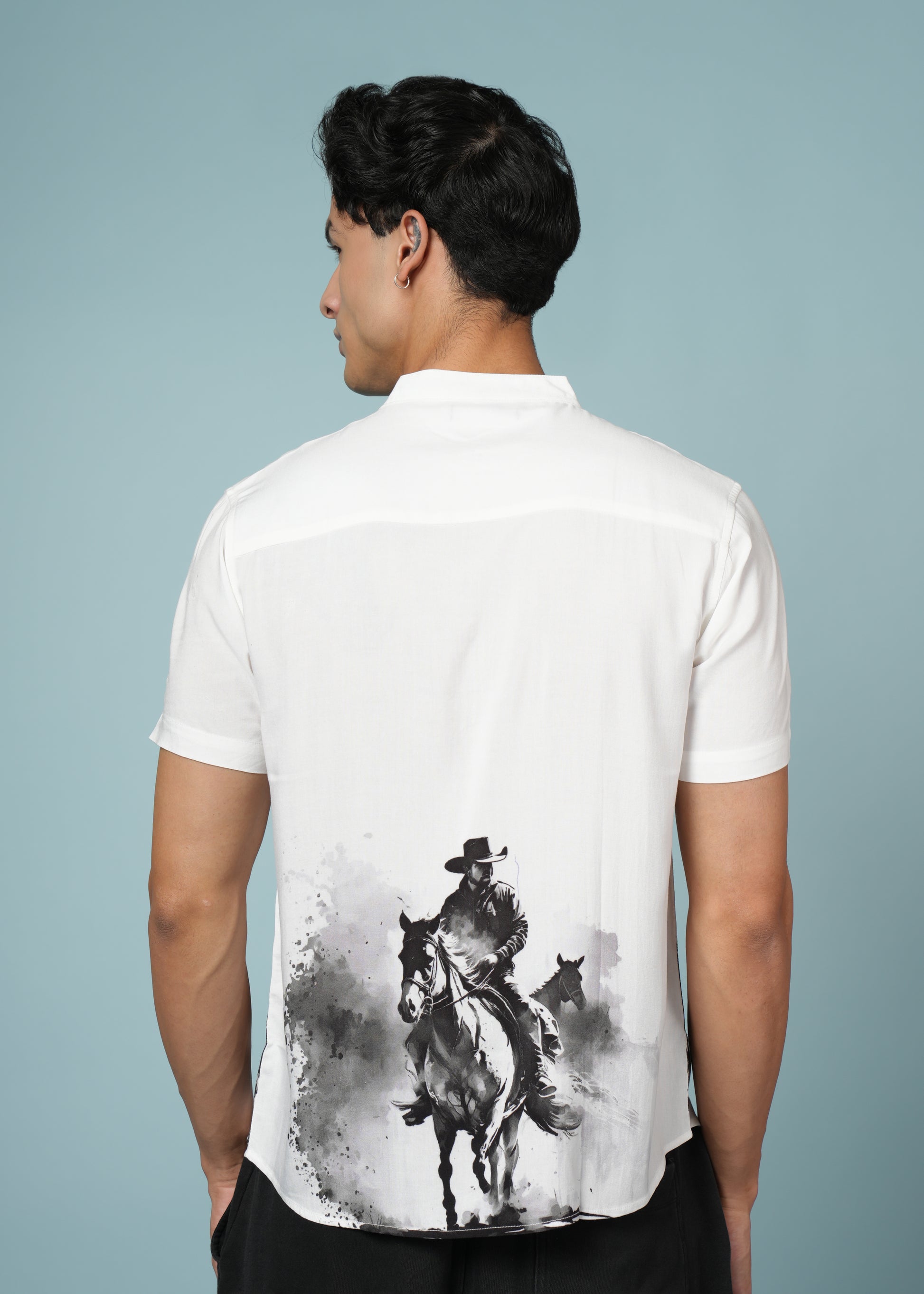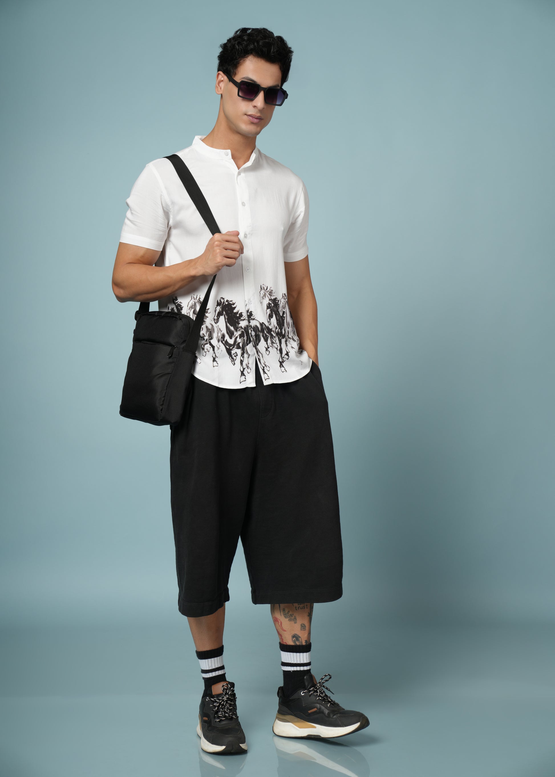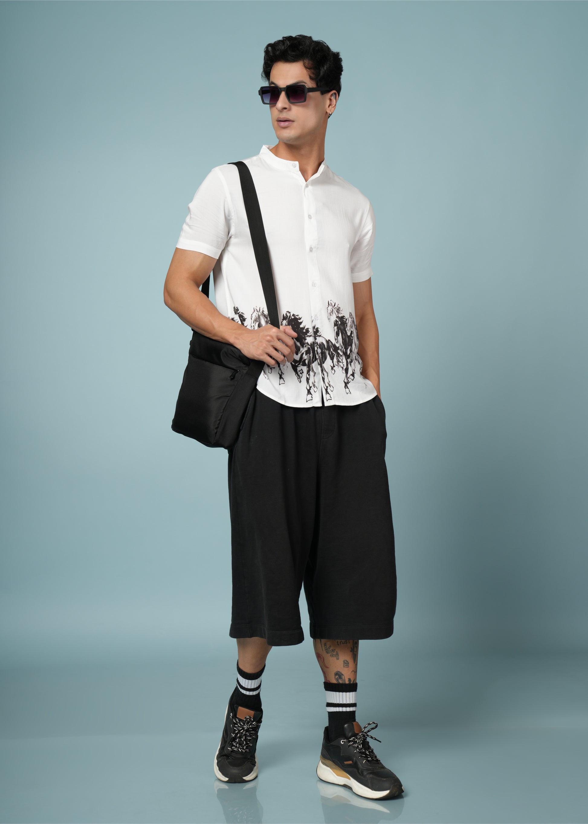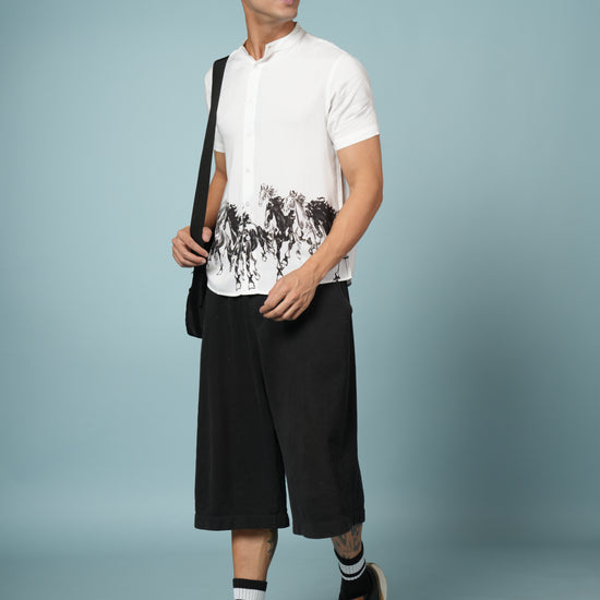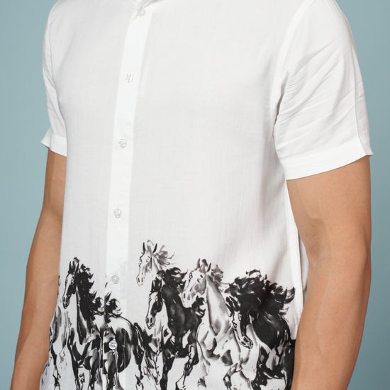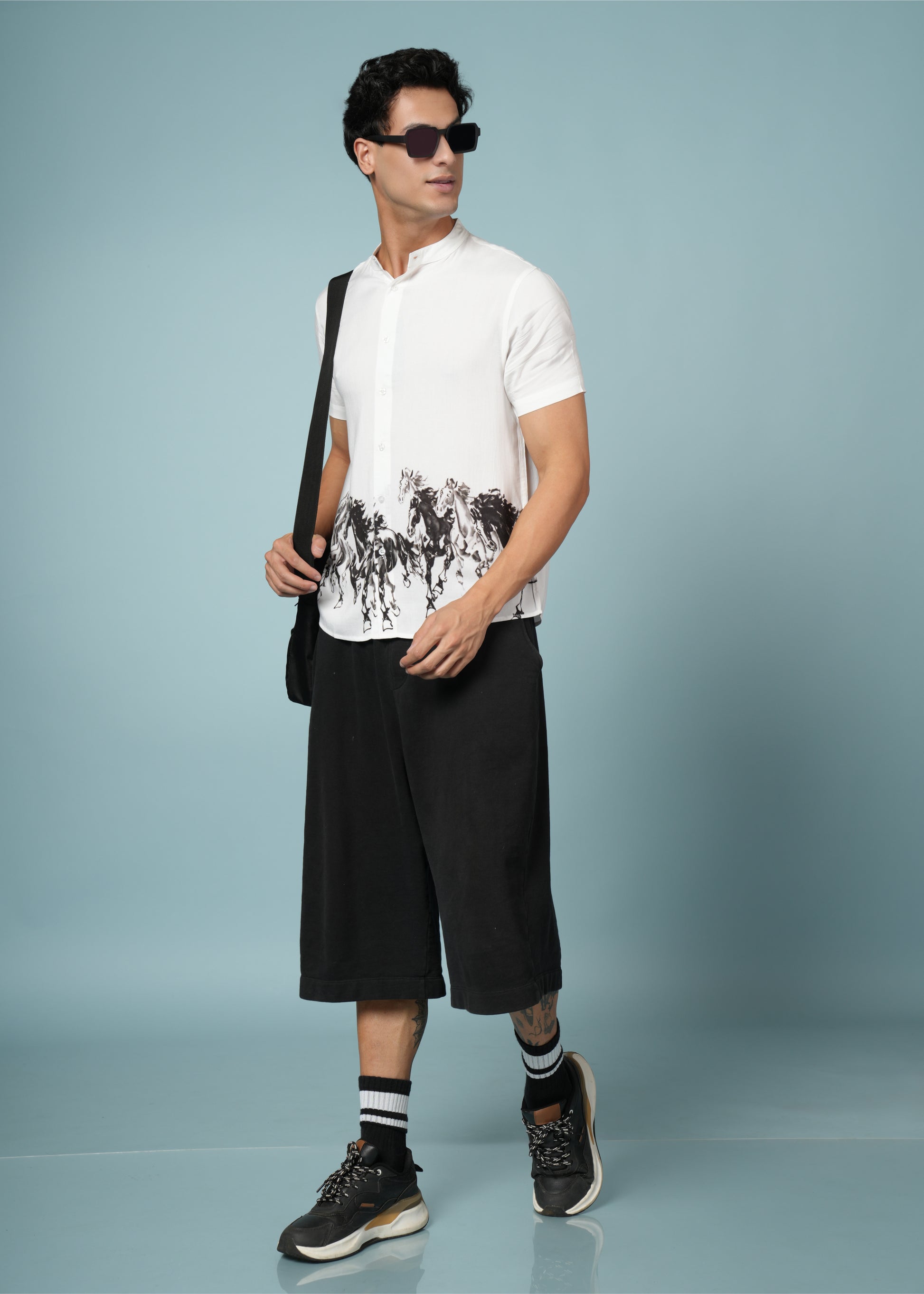 Men’s White Printed Shirt with Running Horse Design – Modern Mandarin Collar