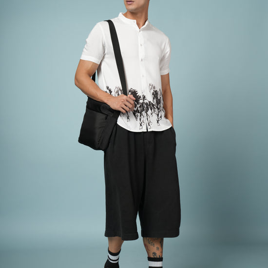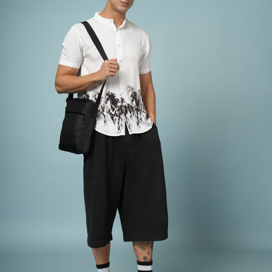 Step into bold sophistication with this Men’s White Printed Shirt, featuring a striking running horse design along the hem. Crafted from premium breathable cotton blend, it offers all-day comfort with a soft, smooth texture. The Mandarin collar and short sleeves add a modern edge, making it perfect for both casual outings and evening get-togethers. Pair it with black trousers or denim for a refined yet stylish look.
