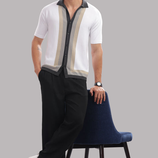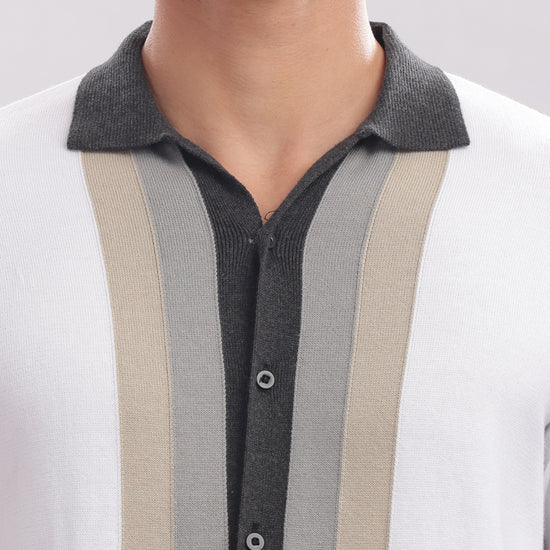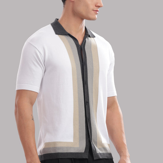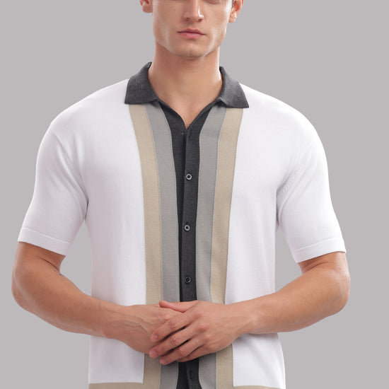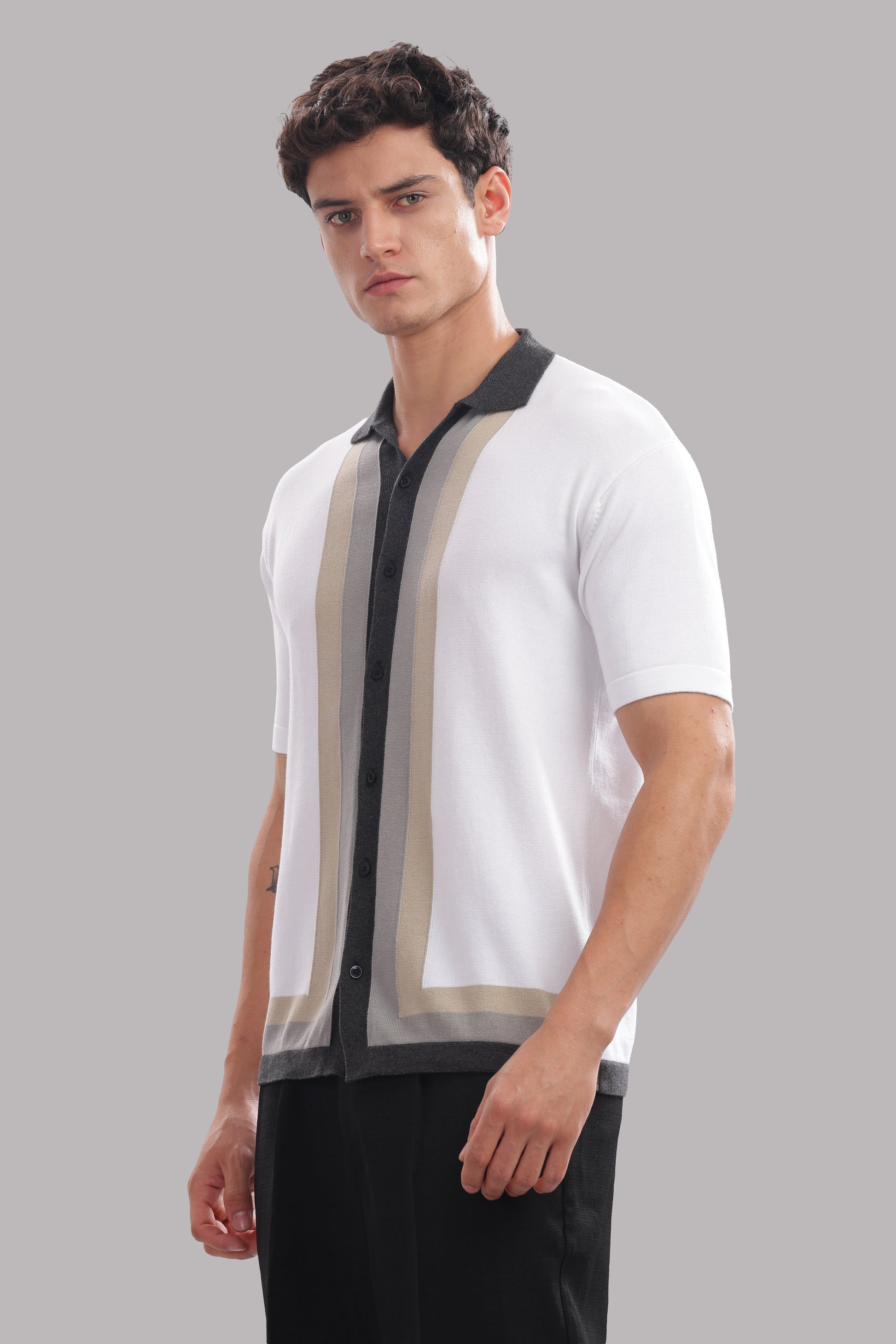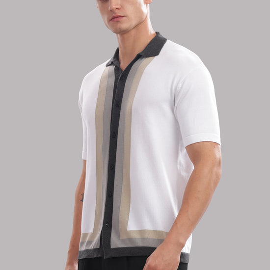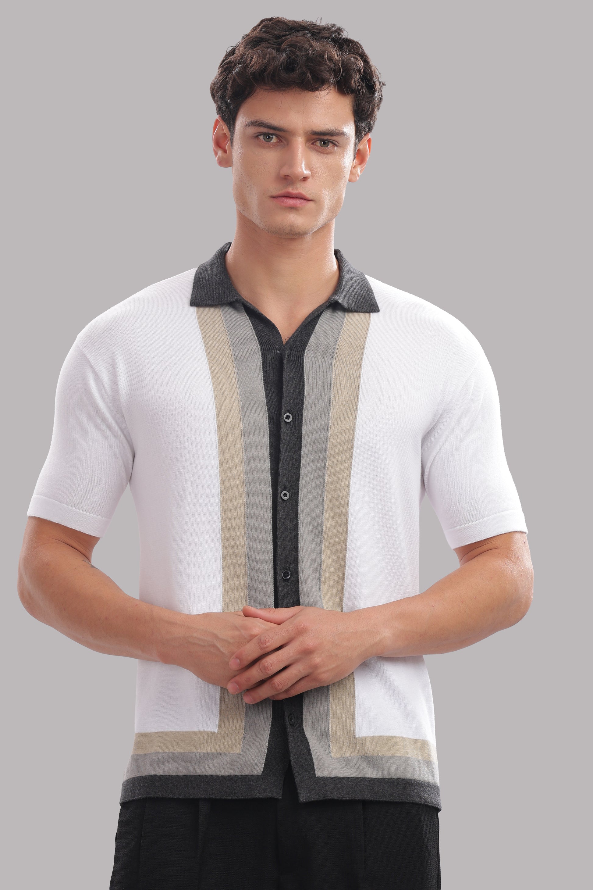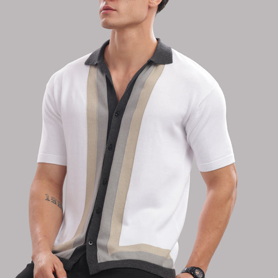 Designed with a sleek white base and contrasting beige and grey vertical panels, this shirt adds a bold, modern edge to your outfit. The button-down front and dark collar detail enhance its smart-casual vibe — ideal for brunches, evenings out, or relaxed office days.
