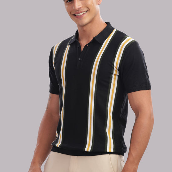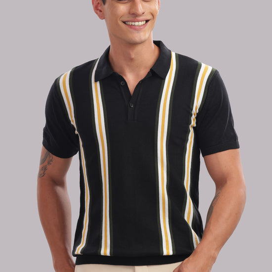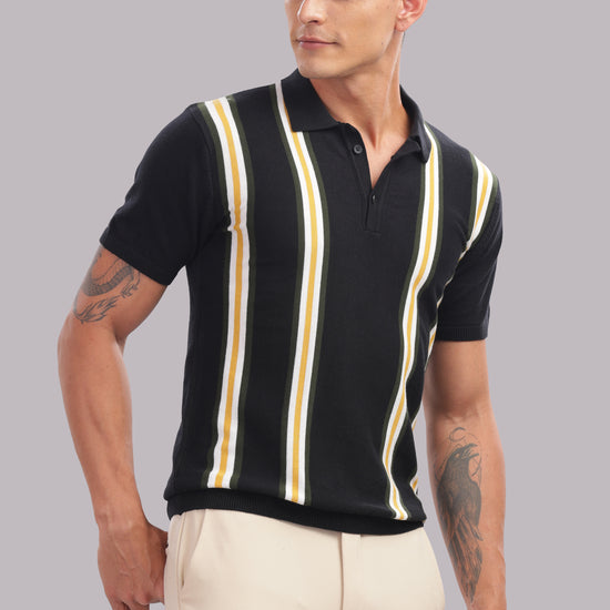 Make a bold statement with this Men’s Striped Polo Shirt, crafted from 100% premium cotton for ultimate comfort and breathability. Designed in a sleek black base with striking vertical yellow, white, and olive stripes, this polo adds a modern twist to timeless style.