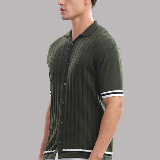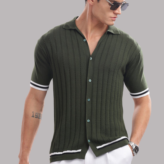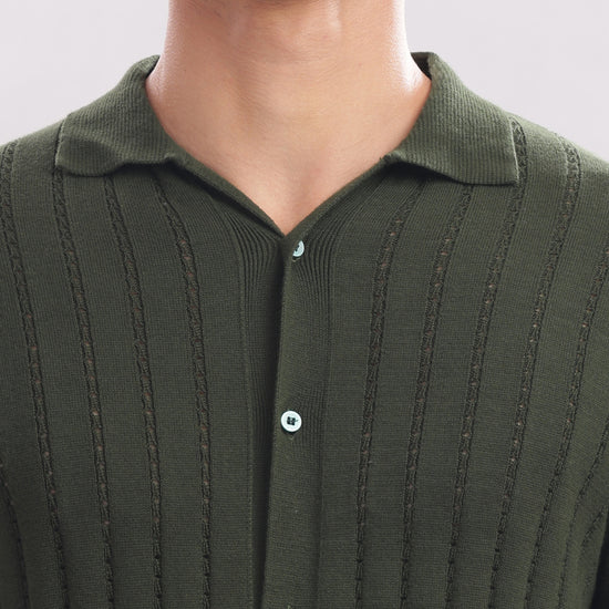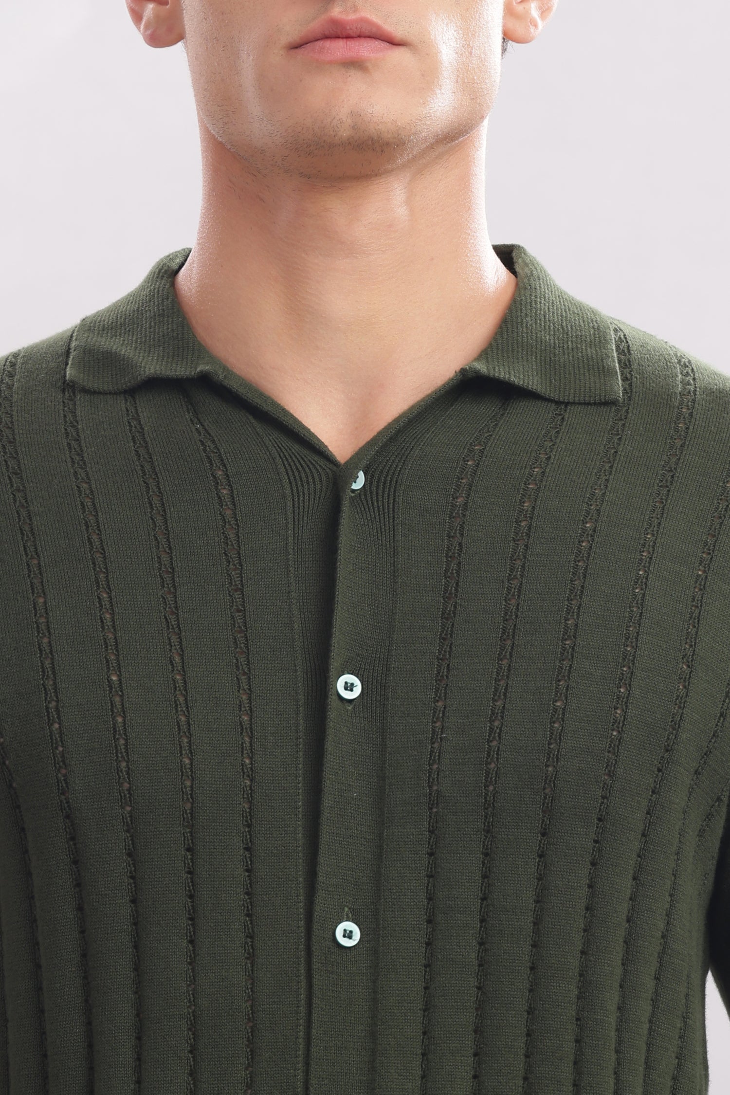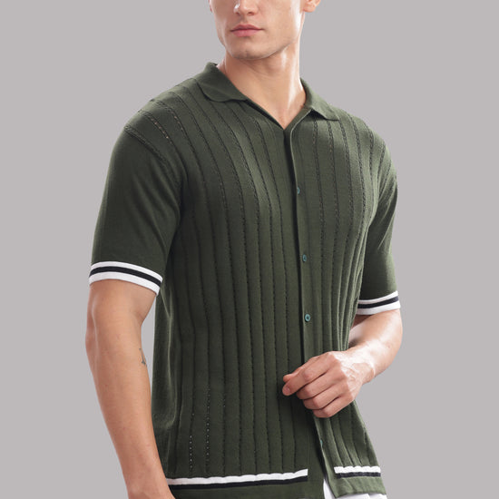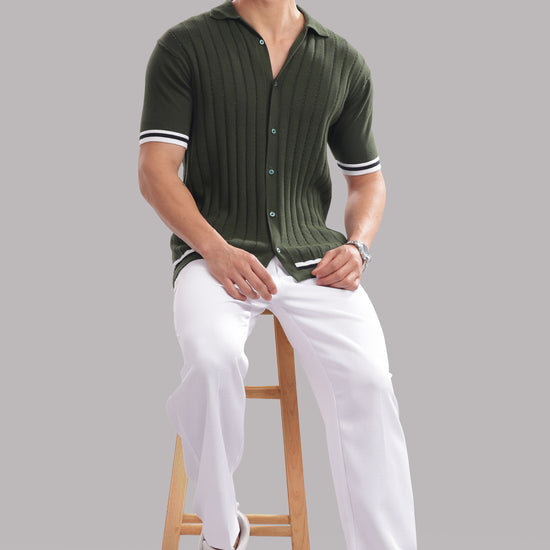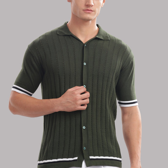 Stay effortlessly stylish with this men’s olive green knitted shirt, crafted from 100% premium cotton for unmatched comfort and breathability. Designed with a sleek vertical textured knit pattern and classic button-down front, it offers a modern twist to timeless sophistication.