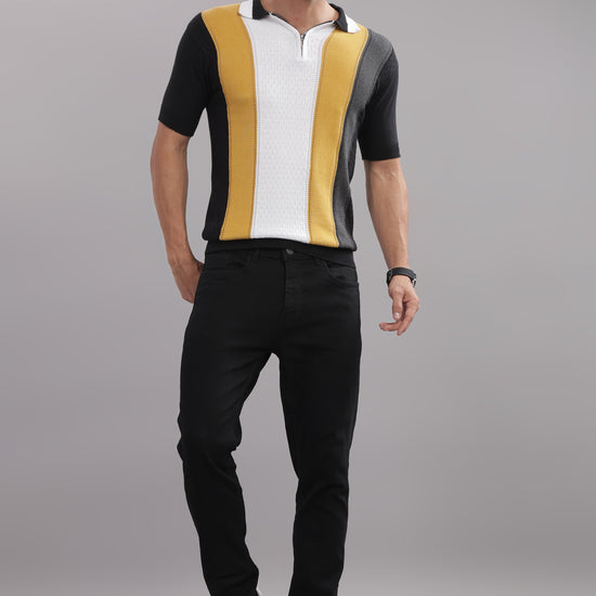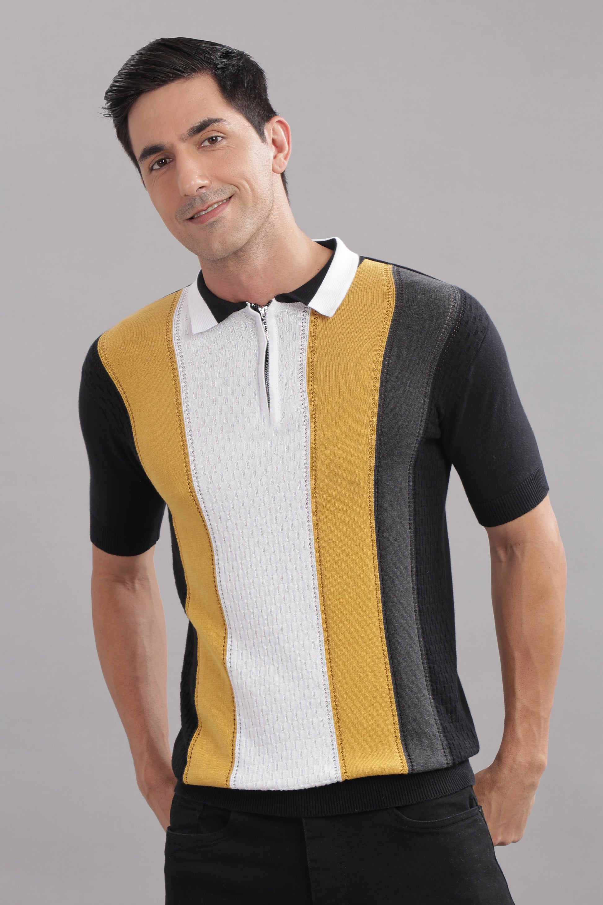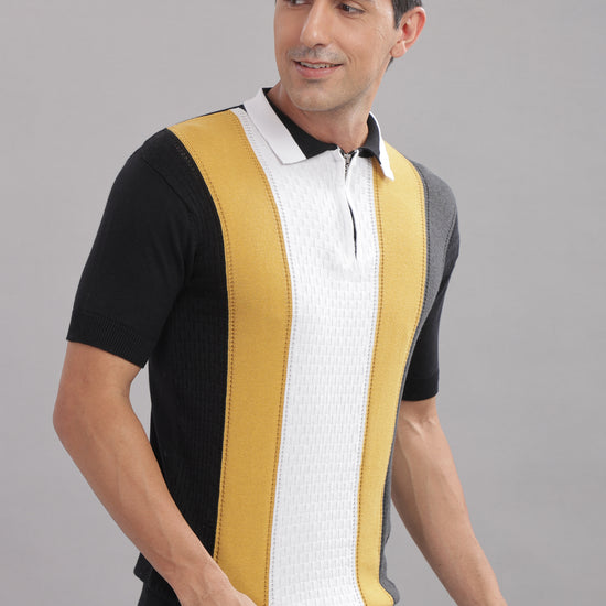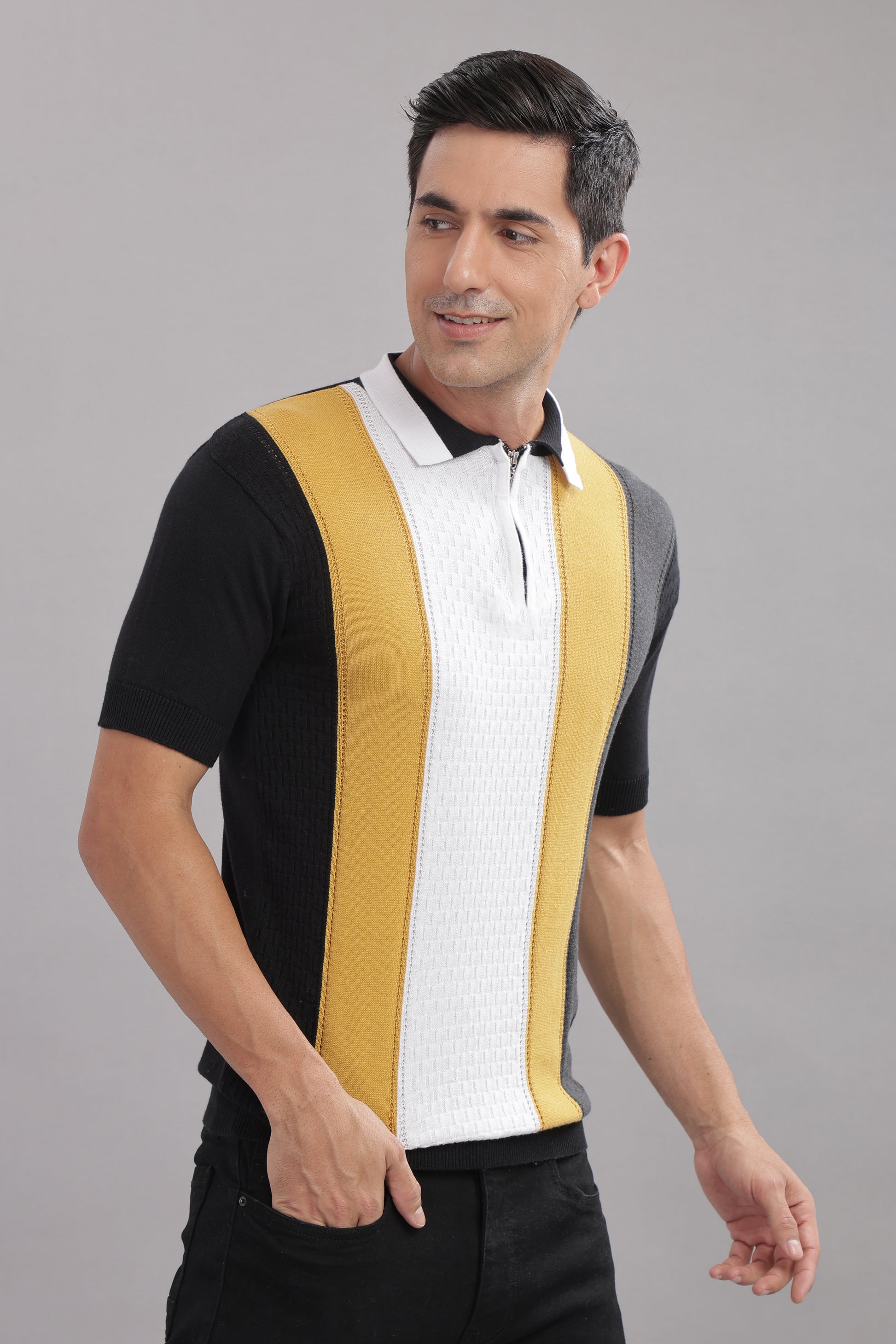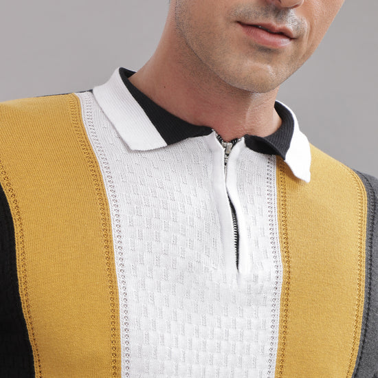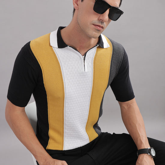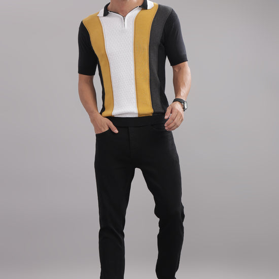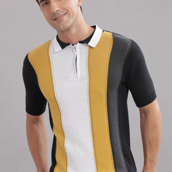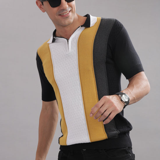 Redefine your casual style with this Men’s 100% Cotton Colour - block Polo T-shirt, blending comfort with bold design. Crafted from pure premium cotton, this tee offers a soft, breathable feel and lasting comfort. The zip-neck collar adds a trendy twist, while the colour-block pattern in mustard, white, and charcoal tones gives it a modern, sophisticated look. Ideal for brunches, casual Fridays, or weekend outings, this T-shirt ensures you look effortlessly stylish all day.
