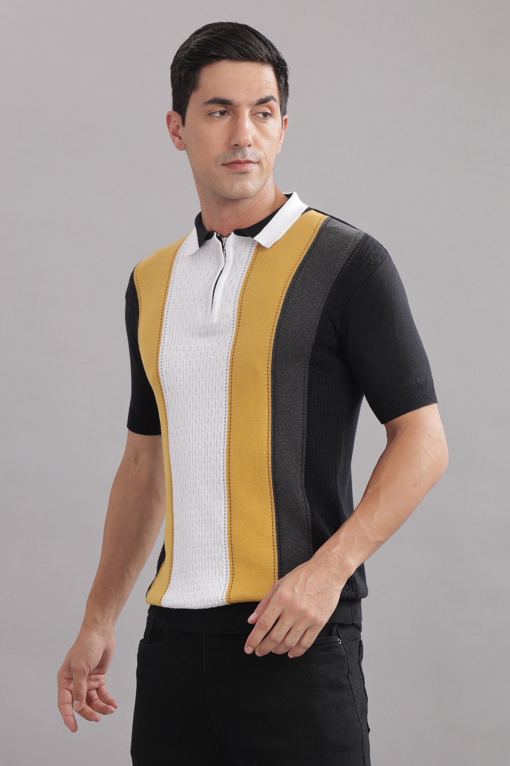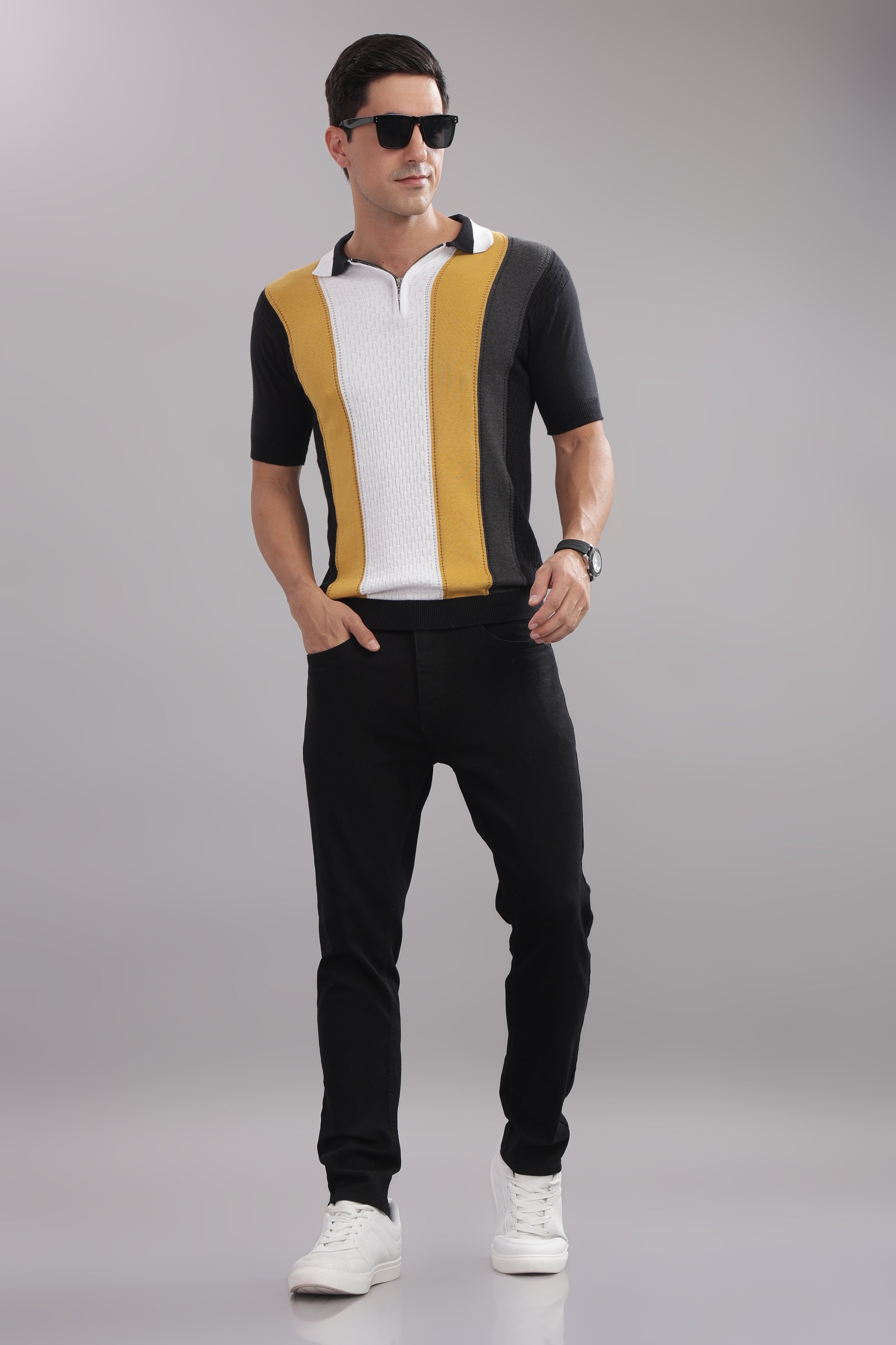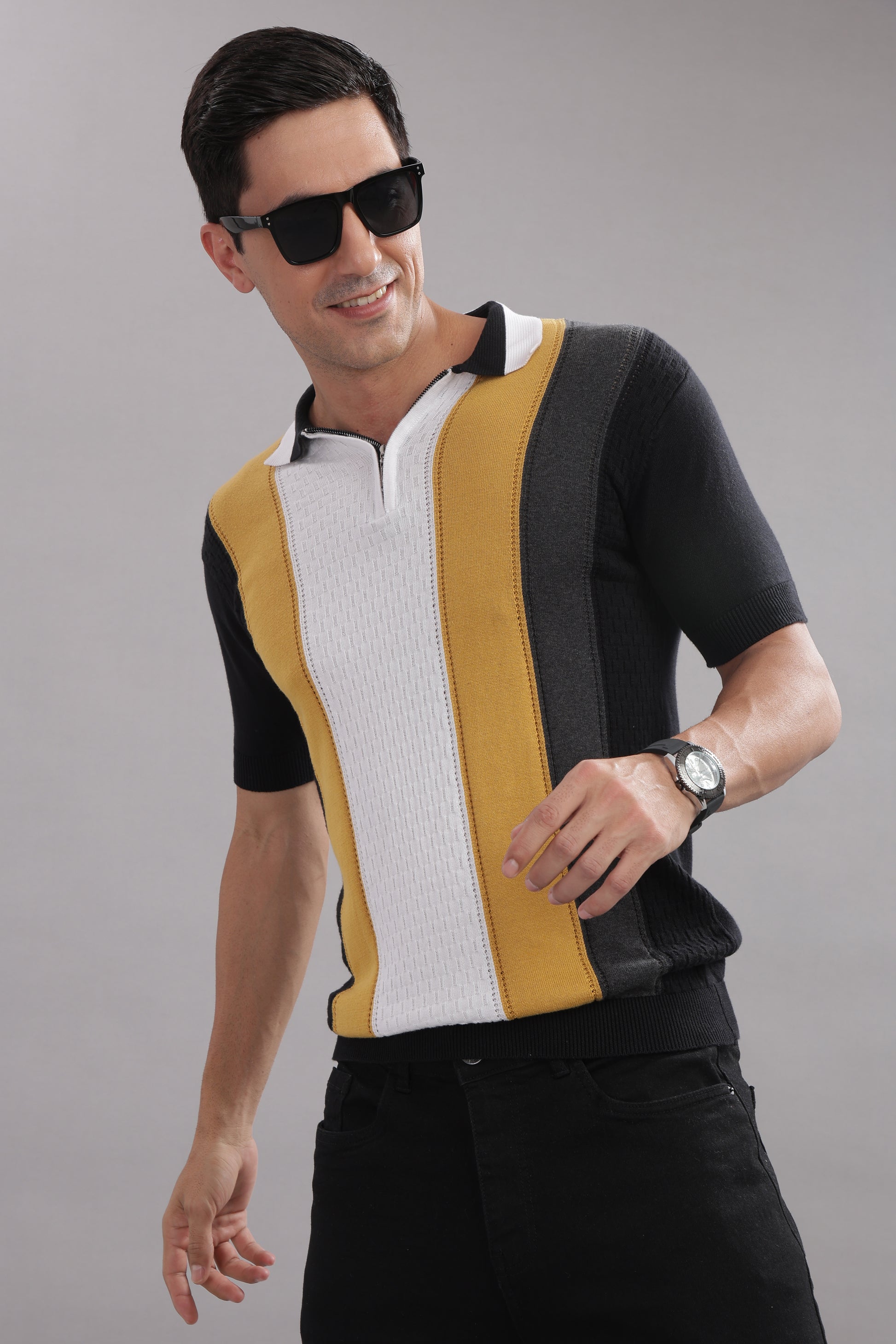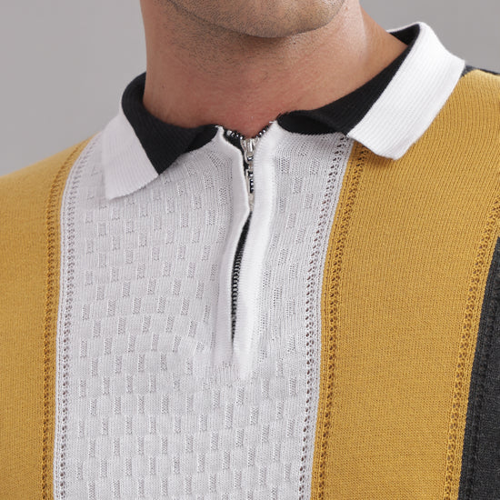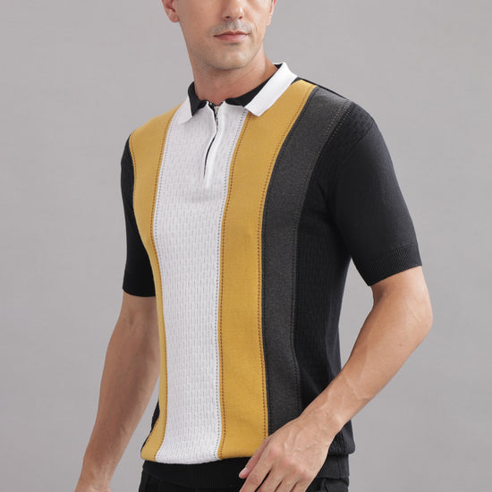 Redefine your casual style with this Men’s 100% Cotton Colour - block Polo T-shirt, blending comfort with bold design. Crafted from pure premium cotton, this tee offers a soft, breathable feel and lasting comfort. The zip-neck collar adds a trendy twist, while the colour-block pattern in mustard, white, and charcoal tones gives it a modern, sophisticated look. Ideal for brunches, casual Fridays, or weekend outings, this T-shirt ensures you look effortlessly stylish all day.