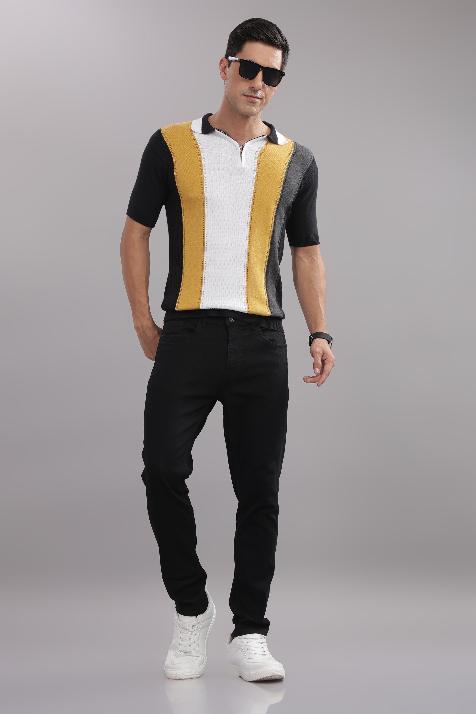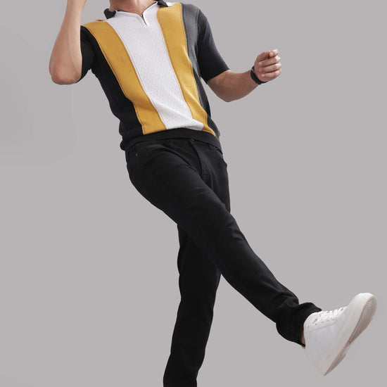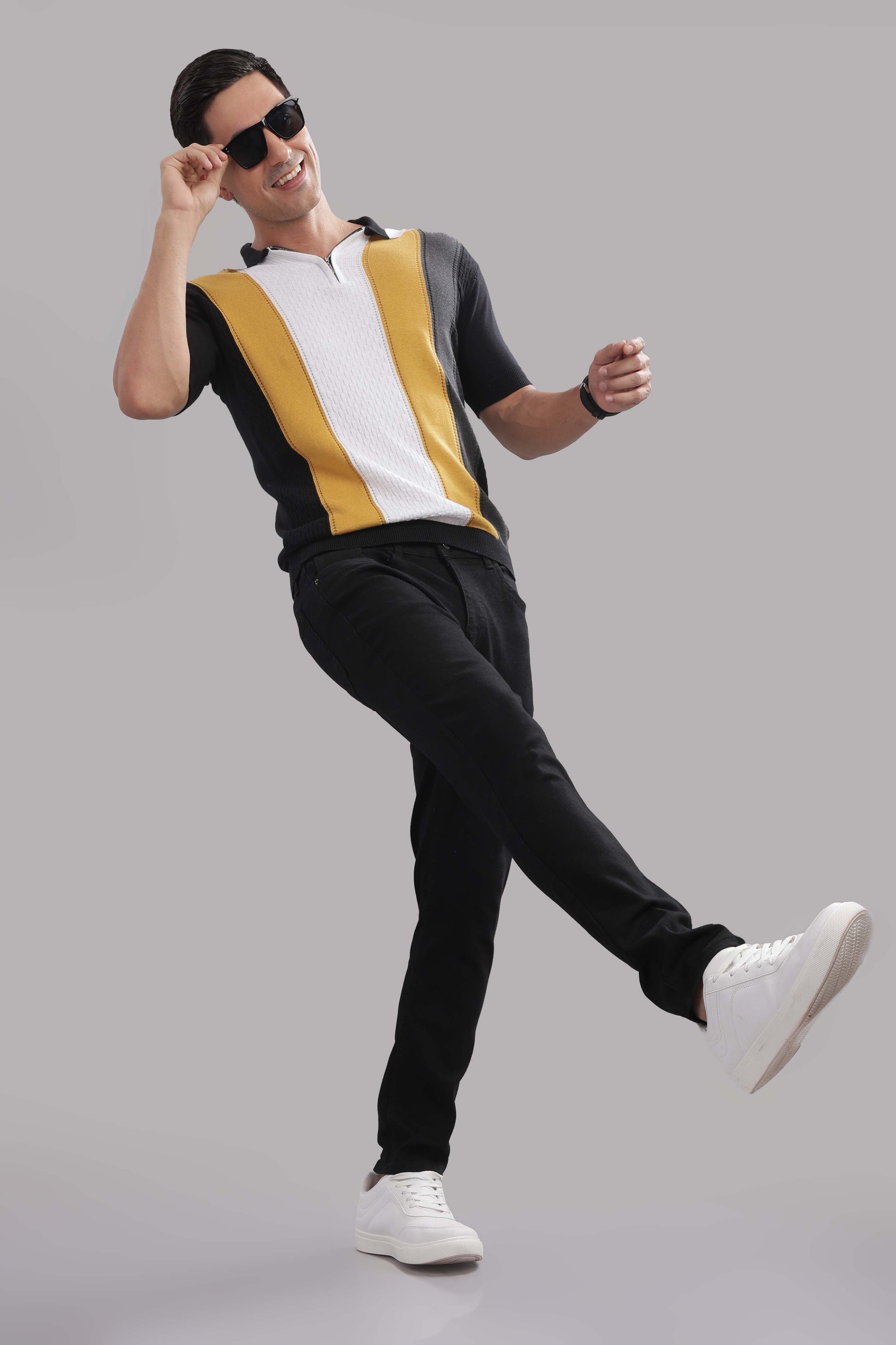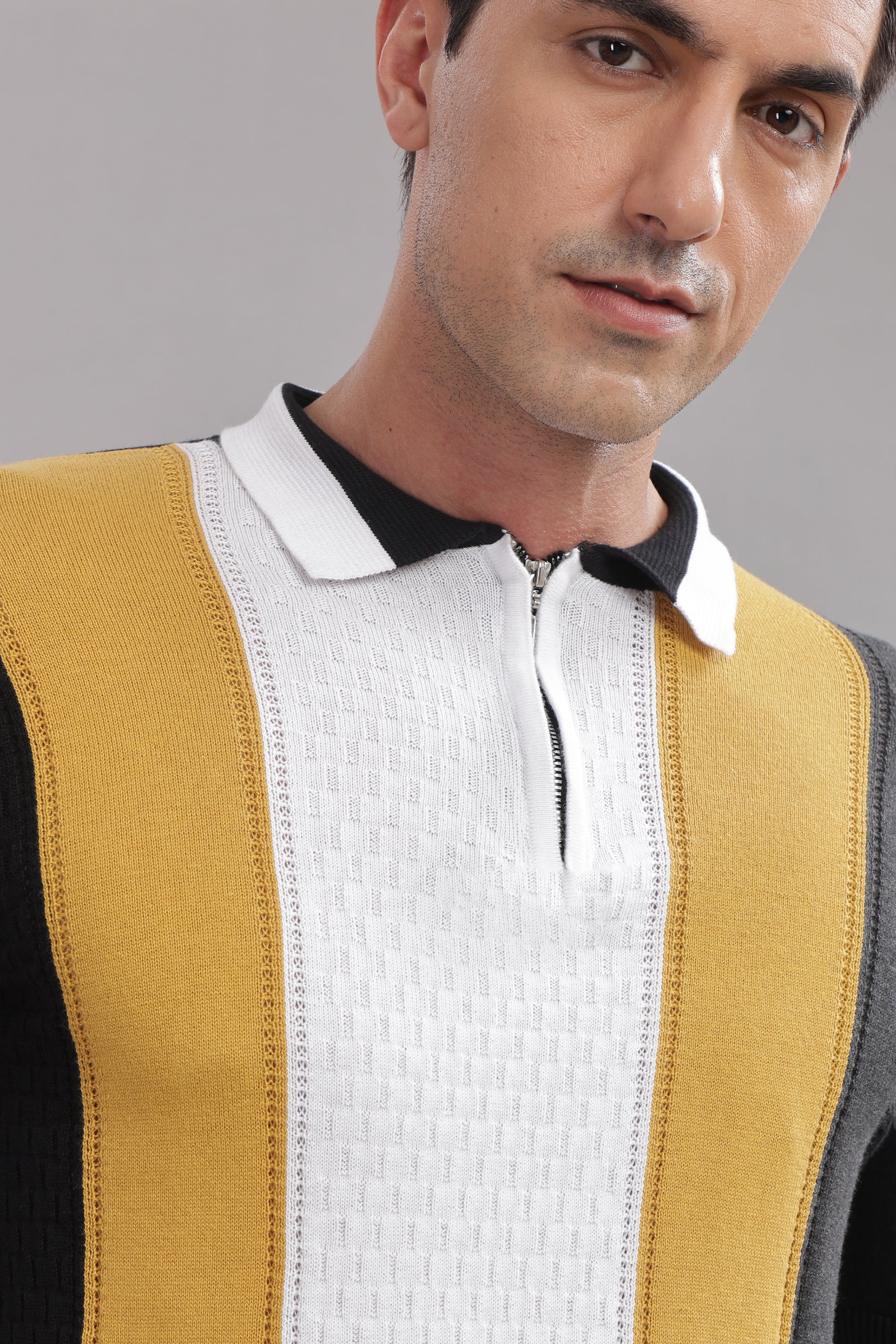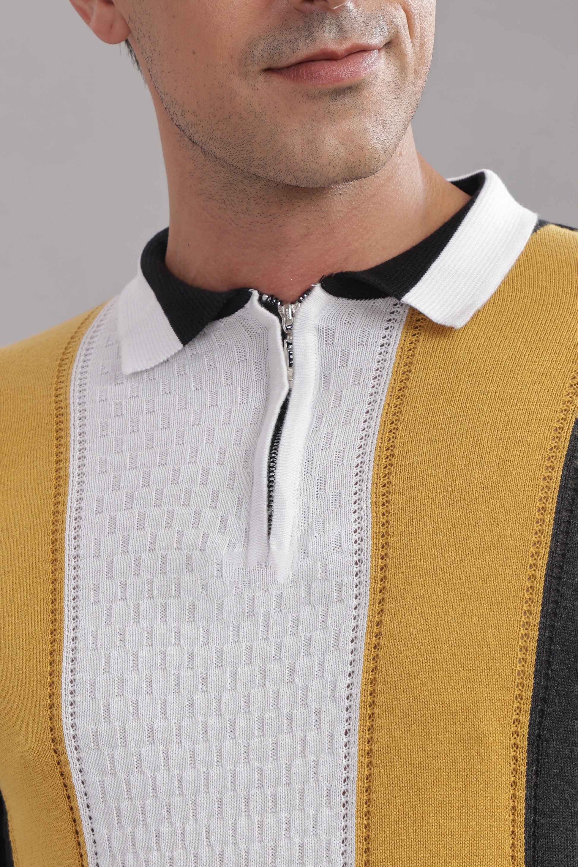 Redefine your casual style with this Men’s 100% Cotton Colour - block Polo T-shirt, blending comfort with bold design. Crafted from pure premium cotton, this tee offers a soft, breathable feel and lasting comfort. The zip-neck collar adds a trendy twist, while the colour-block pattern in mustard, white, and charcoal tones gives it a modern, sophisticated look. Ideal for brunches, casual Fridays, or weekend outings, this T-shirt ensures you look effortlessly stylish all day.