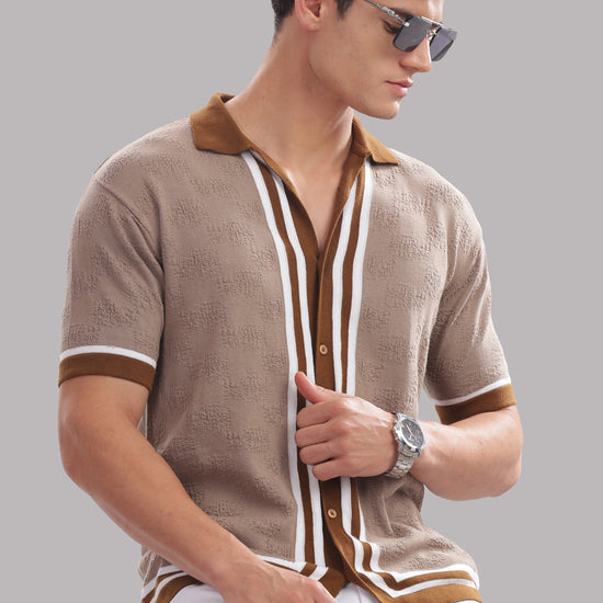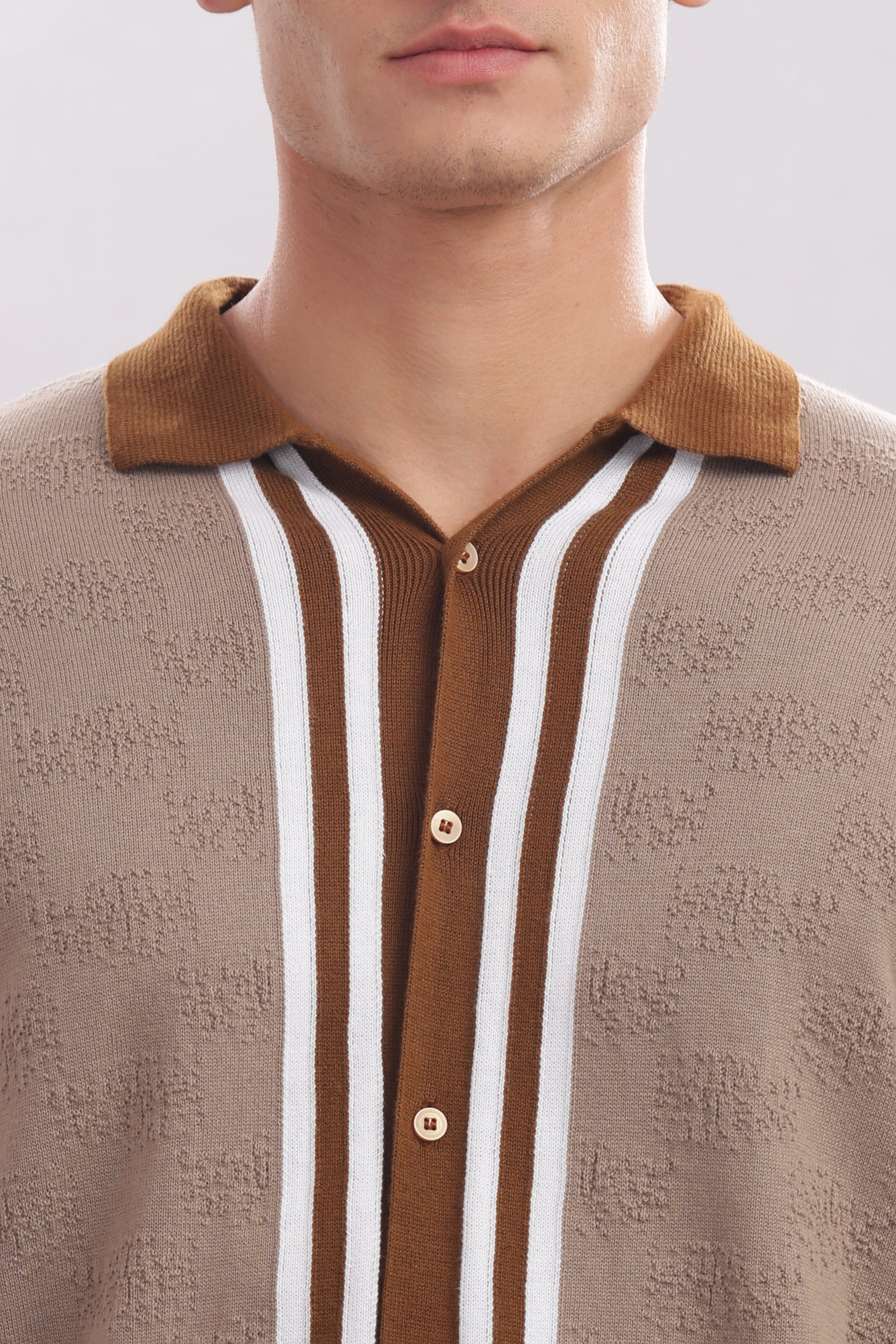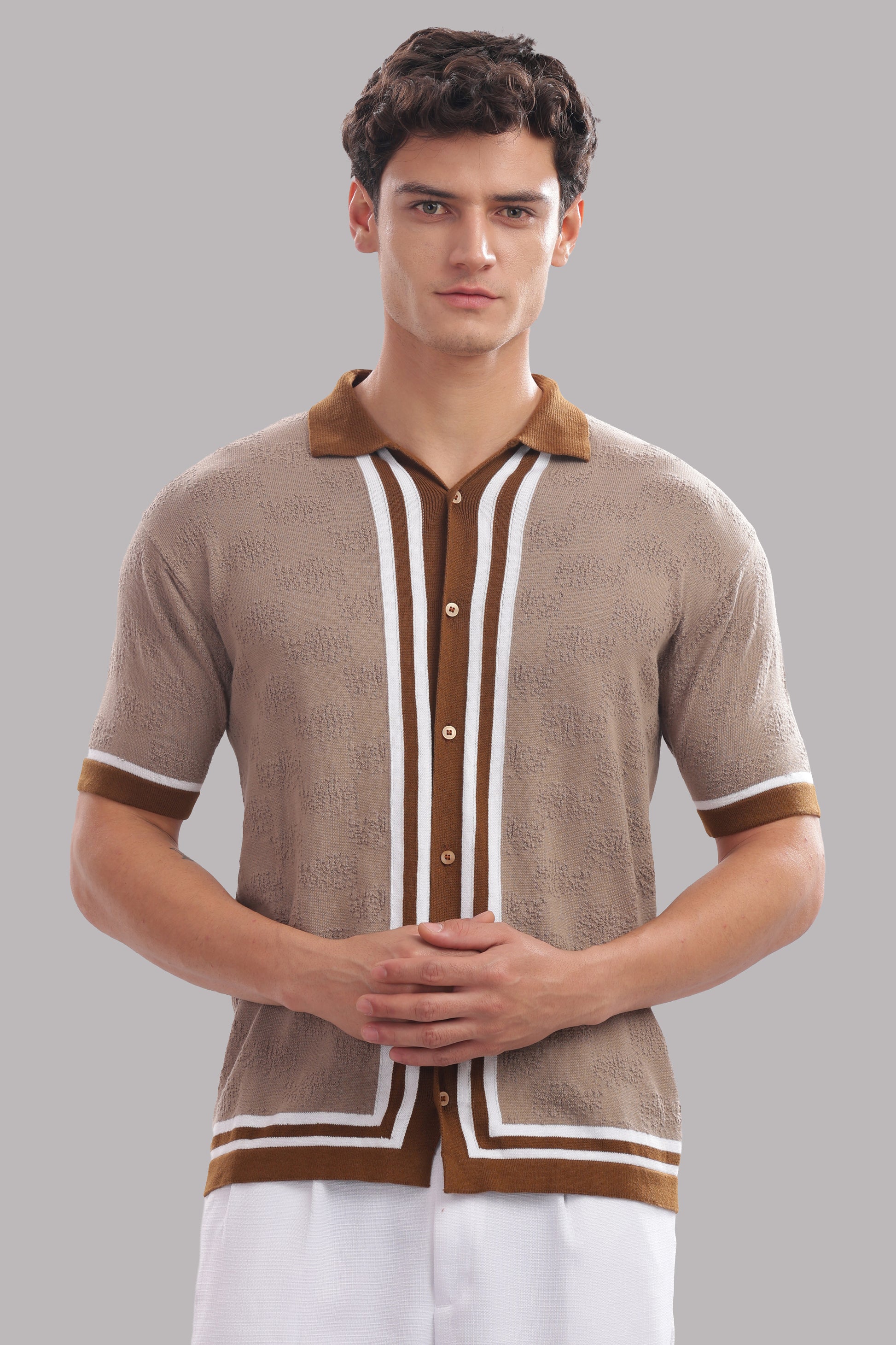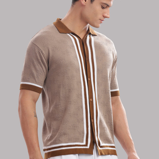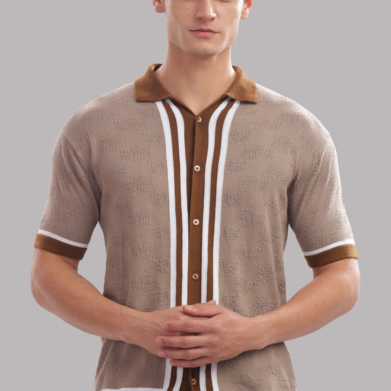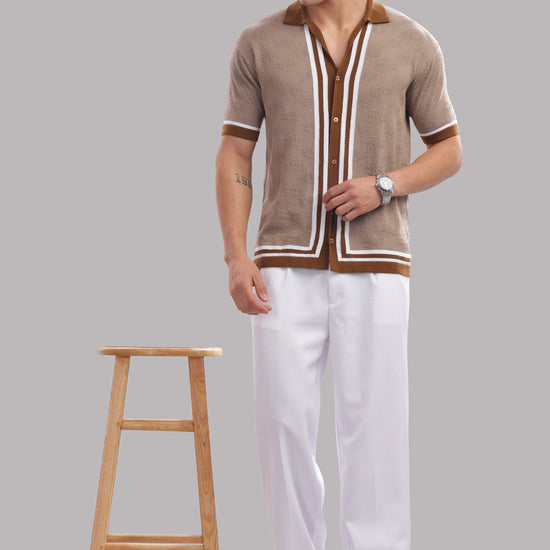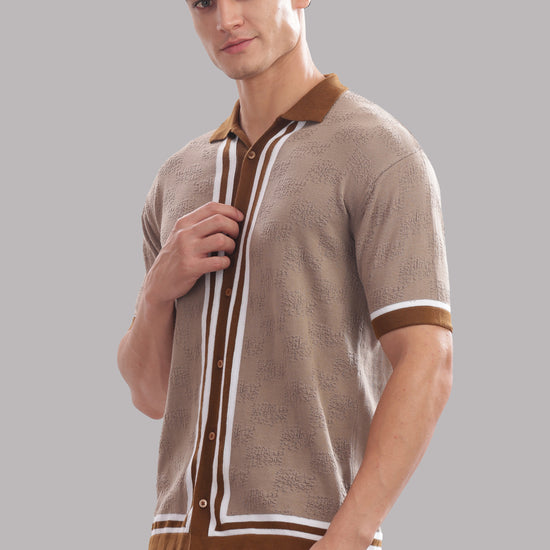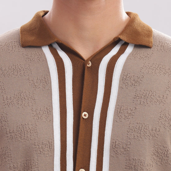 Step up your casual wardrobe with this Men’s Textured Button-Down Polo Shirt, crafted from 100% premium cotton for a soft, breathable, and skin-friendly feel. Featuring a refined beige base with brown and white contrast borders, this shirt blends timeless charm with a modern twist. The textured knit design adds depth, while the button-down front and spread collar give it a sophisticated, vintage-inspired look.